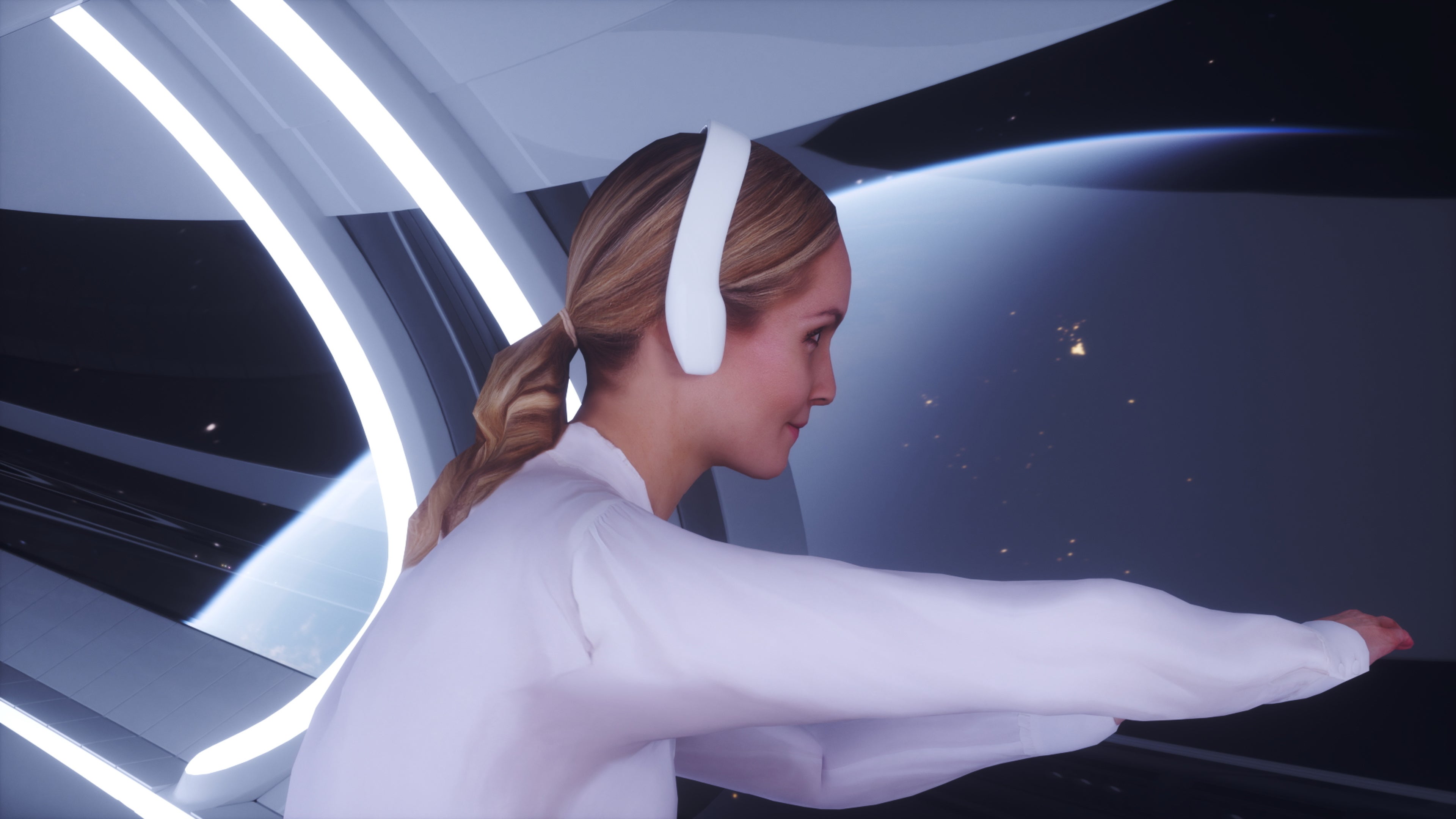 20××年、人類が地球だけではなく宇宙空間でも生活できるようになった世界で、BMI(ブレイン・マシン・インターフェース)(※1)を利用し、宇宙ー地球間で会話ができるコミュニケーションシステム。TSUTEの語源は伝達の「伝」です。2人以上のユーザーがヘッドホン型のBMIデバイスを装着すると、脳に互いの視覚情報が伝達され、まるで相手が目の前にいるかのような映像が映し出されます。音声はヘッドホン状のデバイスを通して、耳へ送られます。BMIの活用により、遠く離れた場所にいても同じ空間にいるかのようなコミュニケーション体験を提案します。