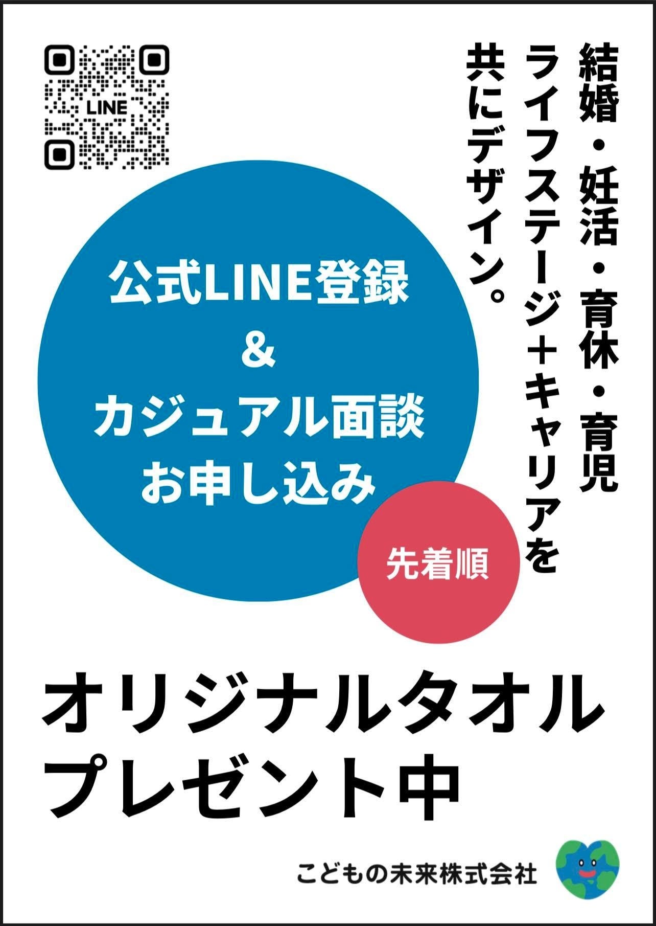 「プレパパ/子育てパパのカジュアルキャリア相談」ワークショップや、公式LINE登録&カジュアル面談申し込みでオリジナルタオルのプレゼントを準備しております。(※数量限定につき、なくなり次第終了となります。)