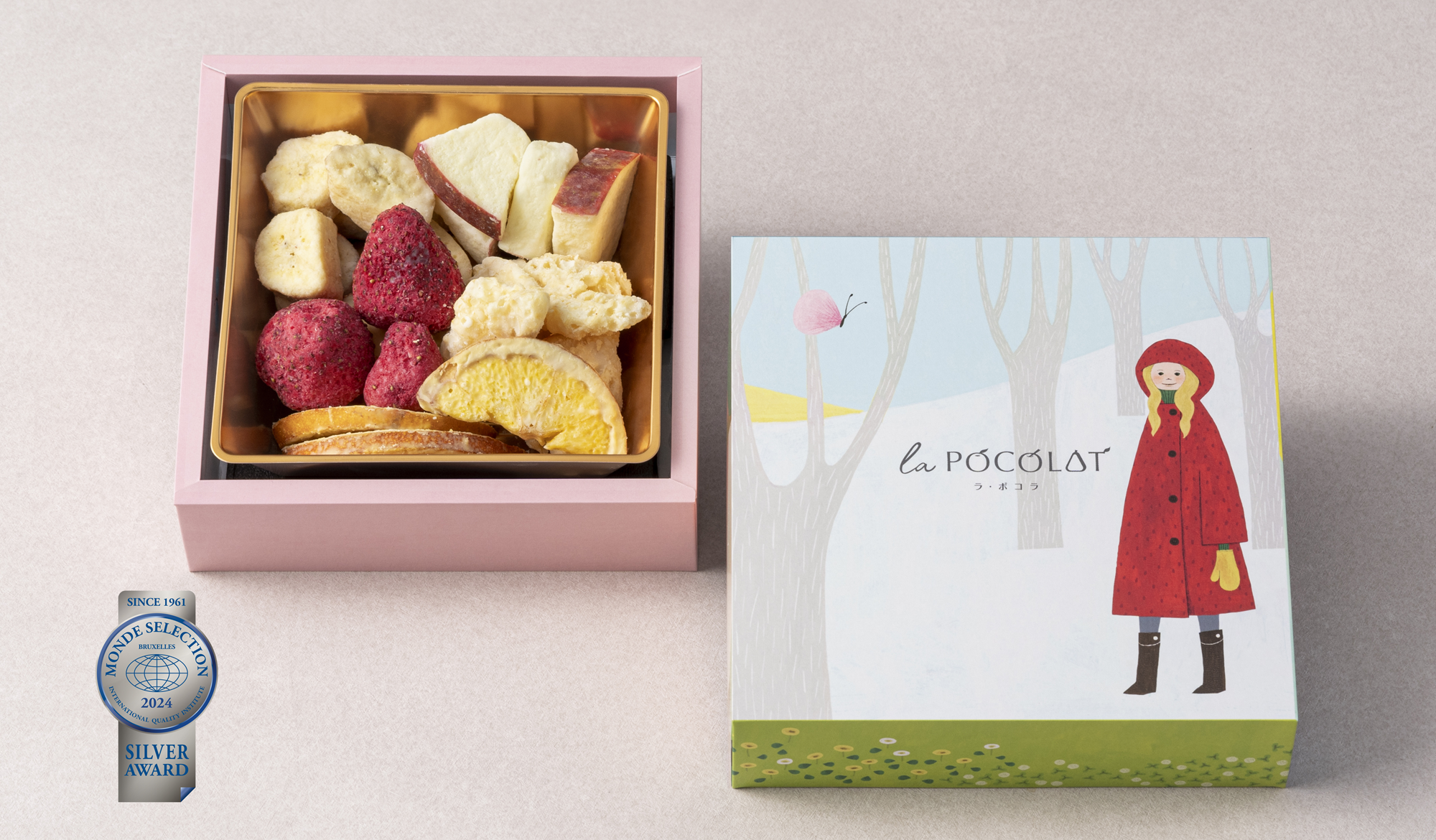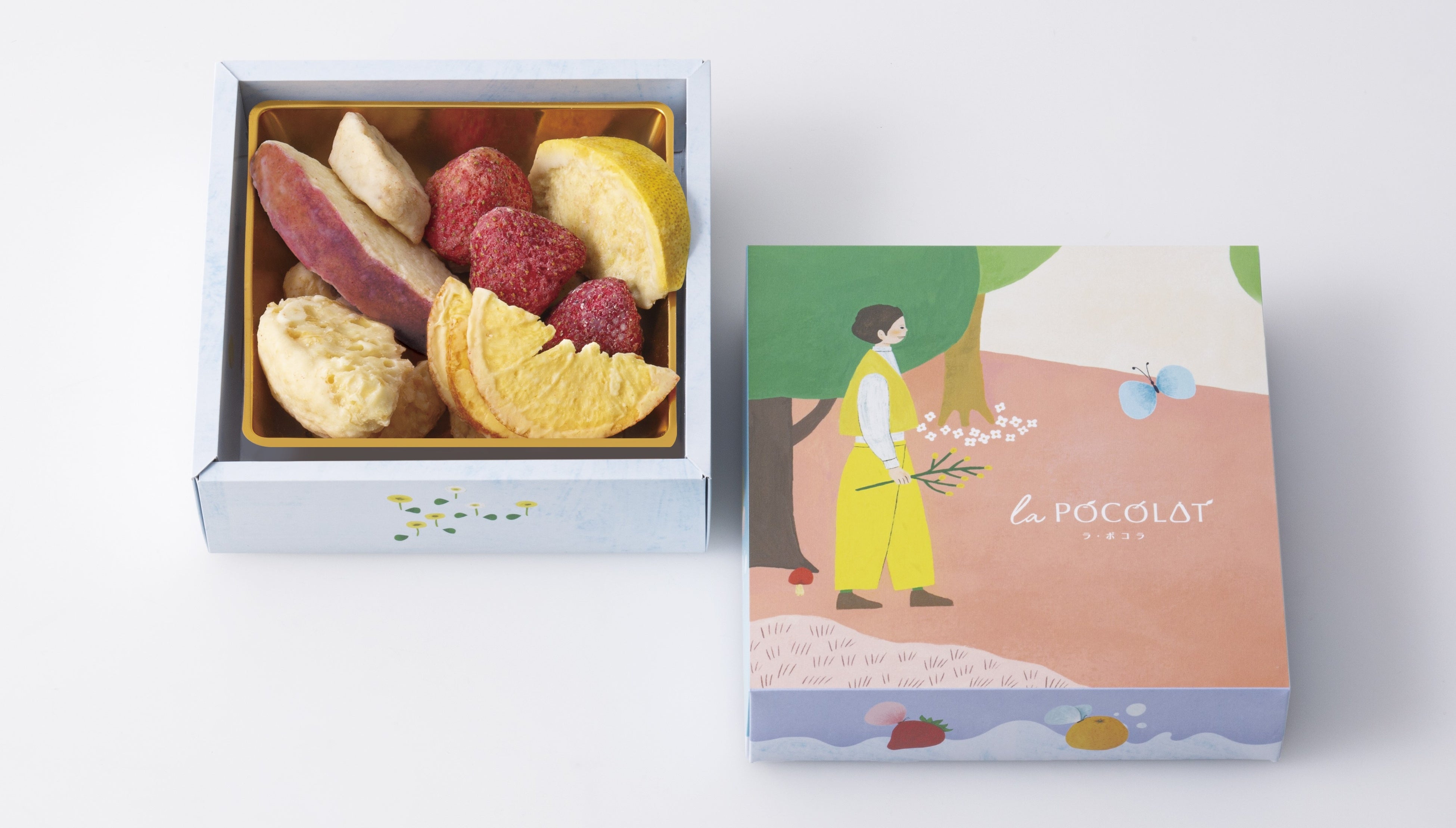 ブランドの登場とともに2023年に発売されたラ・ポコラのフルーツチョコは、世界中からセレクトしたフルーツをフリーズドライし、なめらかなチョコレートをたっぷりとしみこませた、新感覚のスイーツです。口の中で食感が変化し、フルーツの芳醇な香りとチョコレートの優しい甘さが広がります。