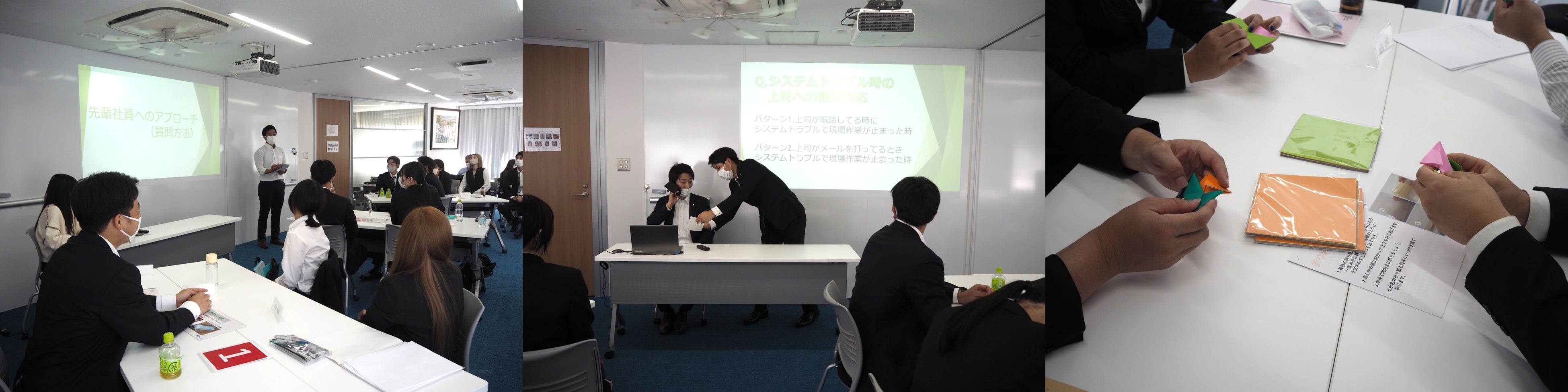 まず、不明点を質問する際に忙しそうな先輩や上司に声をかけづらいという経験から、トラブルが起こった際の先輩社員や上司への報連相についてロールプレイングを行い、フィードバックを実施しました。不明点をそのままにして自分の判断で進めてしまいミスが起きてしまうとお客様から信頼を失うことになる、という話を新入社員は真剣に聞いていました。
