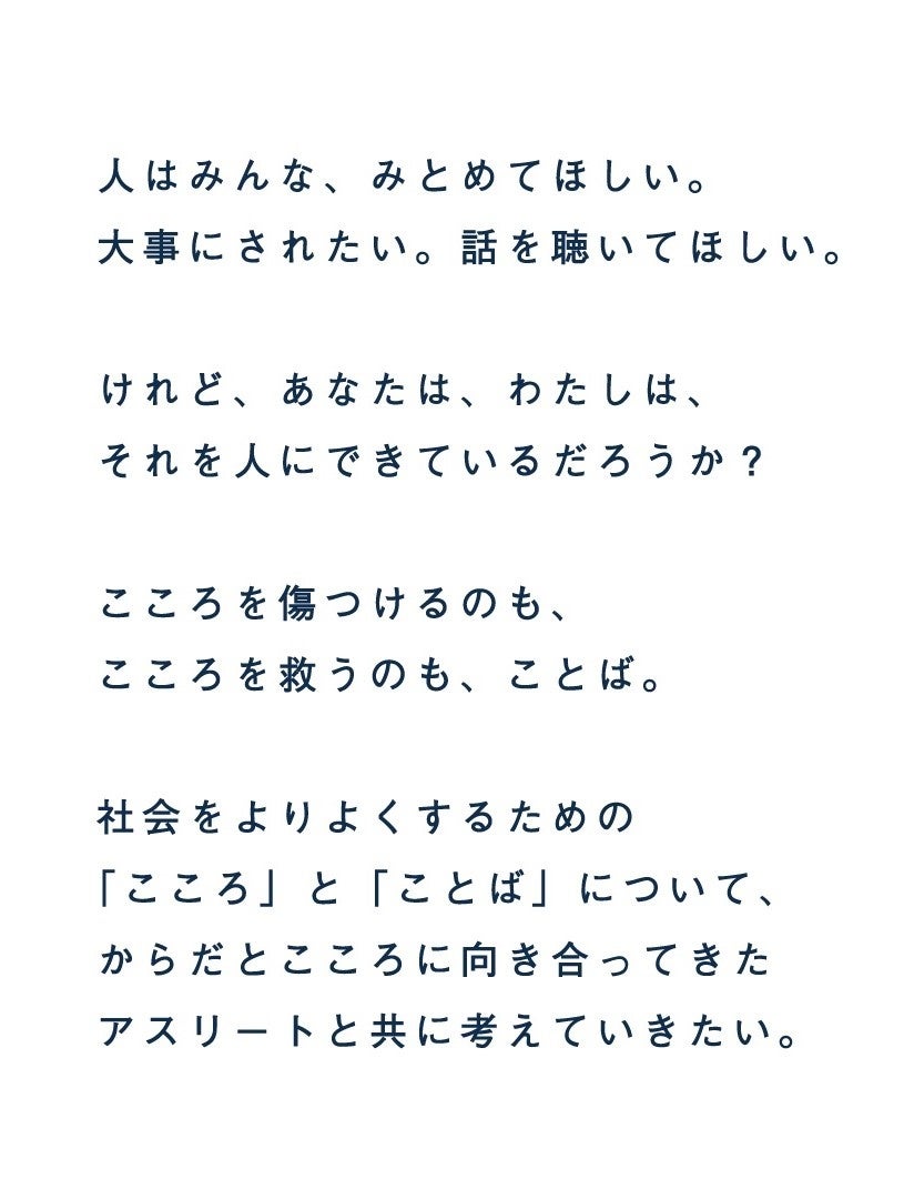 「こころとことば」を軸に、五輪メダリストなどトップアスリートとメンタルヘルスの専門家、そして参加者が一緒に「よりよく生きるために、なにができる?」を考えるイベントを開催します。