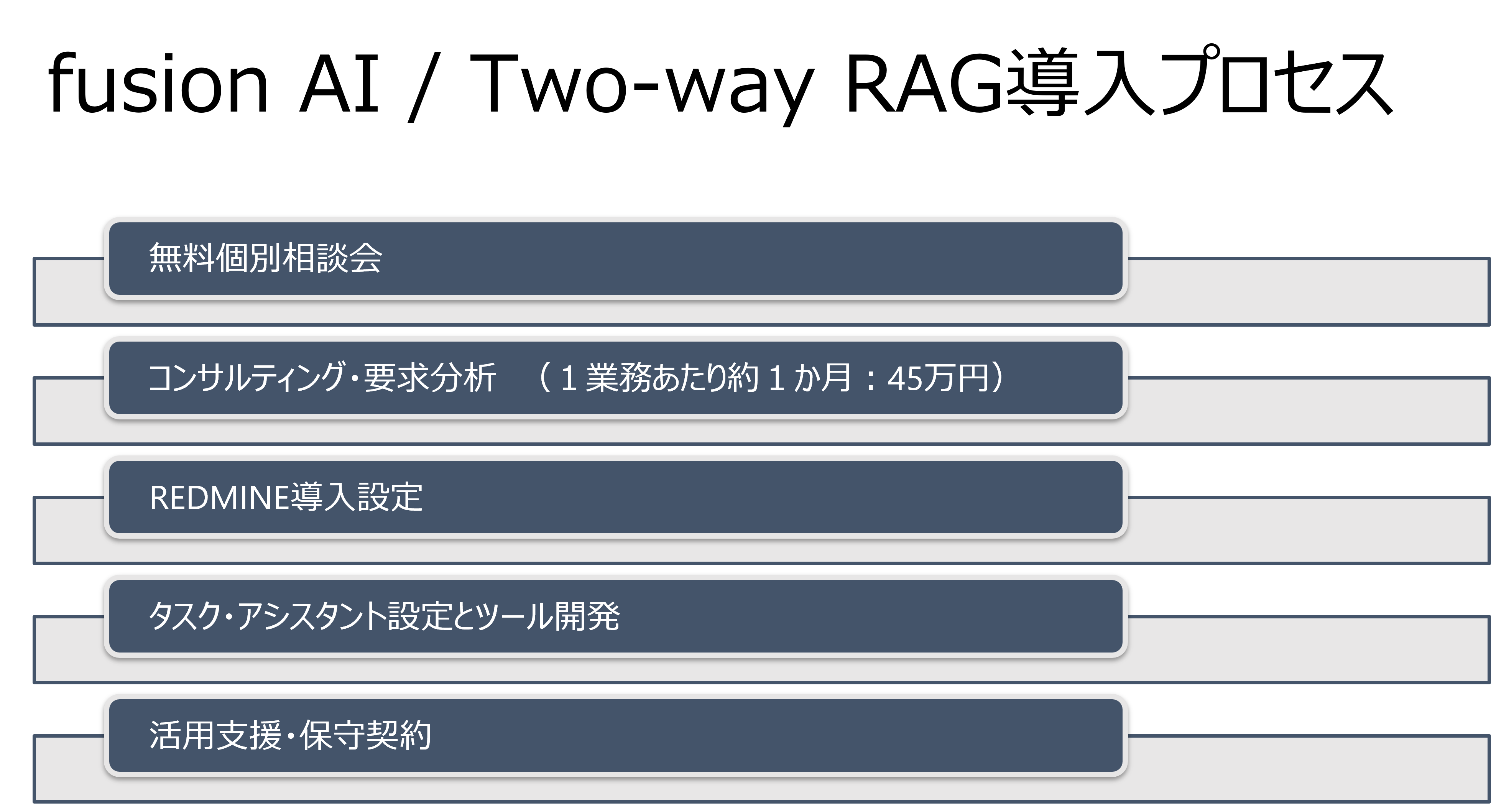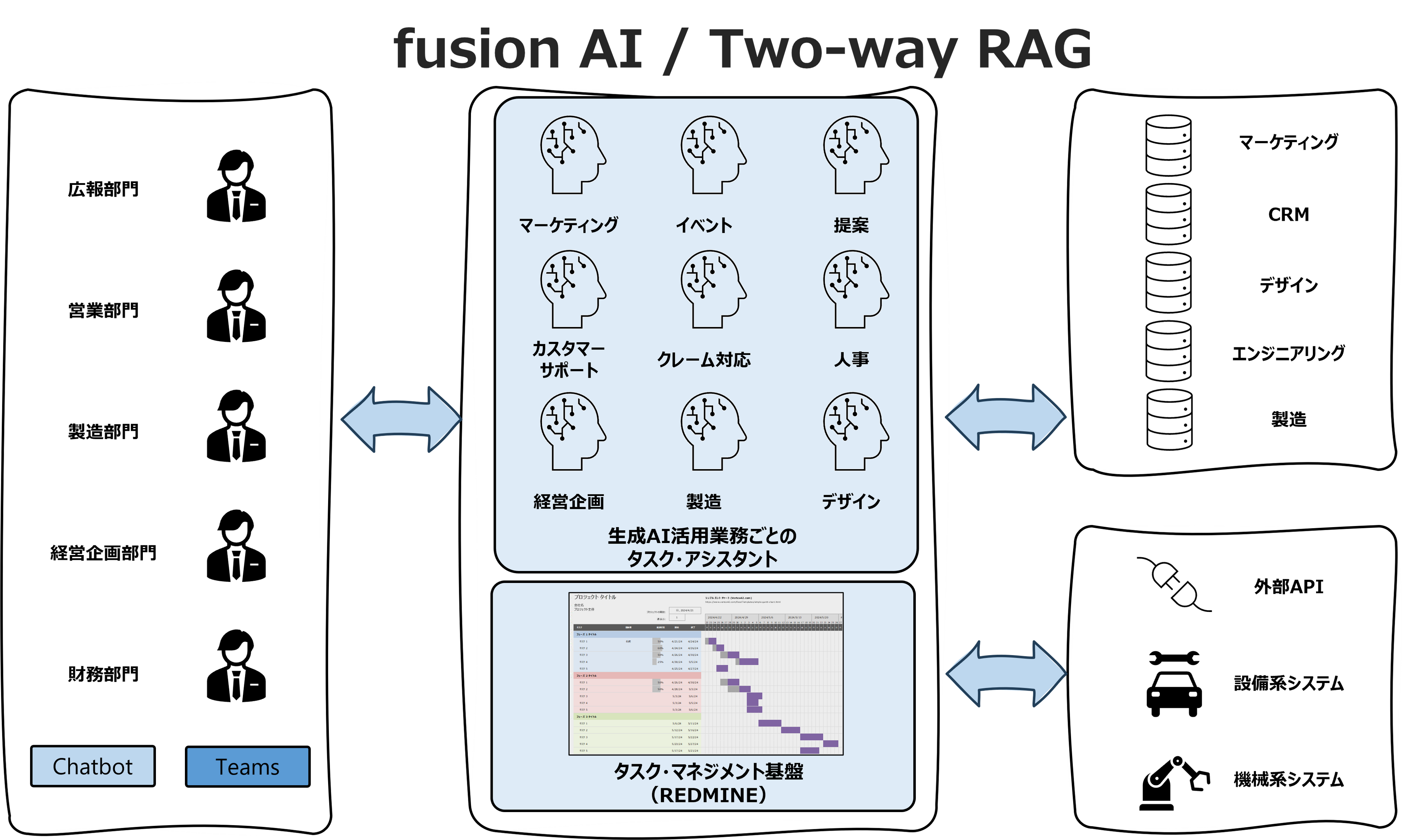 独自のAIタスク・アシスタントを中心に構成されている「fusion AI / Two-Way RAG」は、企業内のチャットボットと完全に連携。これにより、スタッフはタスクやプロジェクトをリアルタイムで追跡し、管理することができます。また、タスク・マネジメント・システムの基盤にはオープンソース・ソフトウェアであるREDMINEを用いているため、さらなるカスタマイズと拡張が可能です。