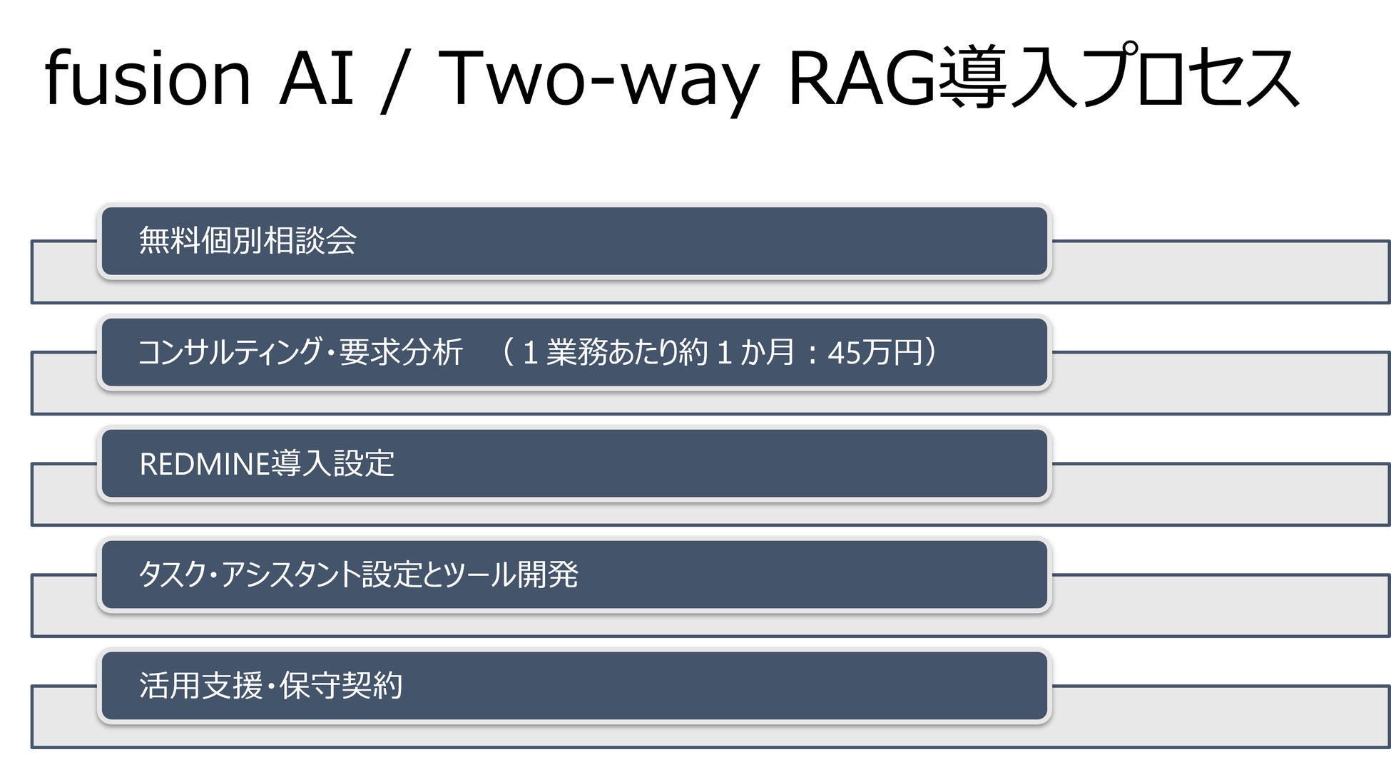 導入プロセスは明確でスムーズであり、無料の個別相談会から始まり、要求分析、タスク・マネジメント基盤であるREDMINEの導入支援、ツールの開発、運用開始に至るまでの全ステップが含まれています。これにより、各企業のニーズに合わせたカスタマイズが実現可能です。