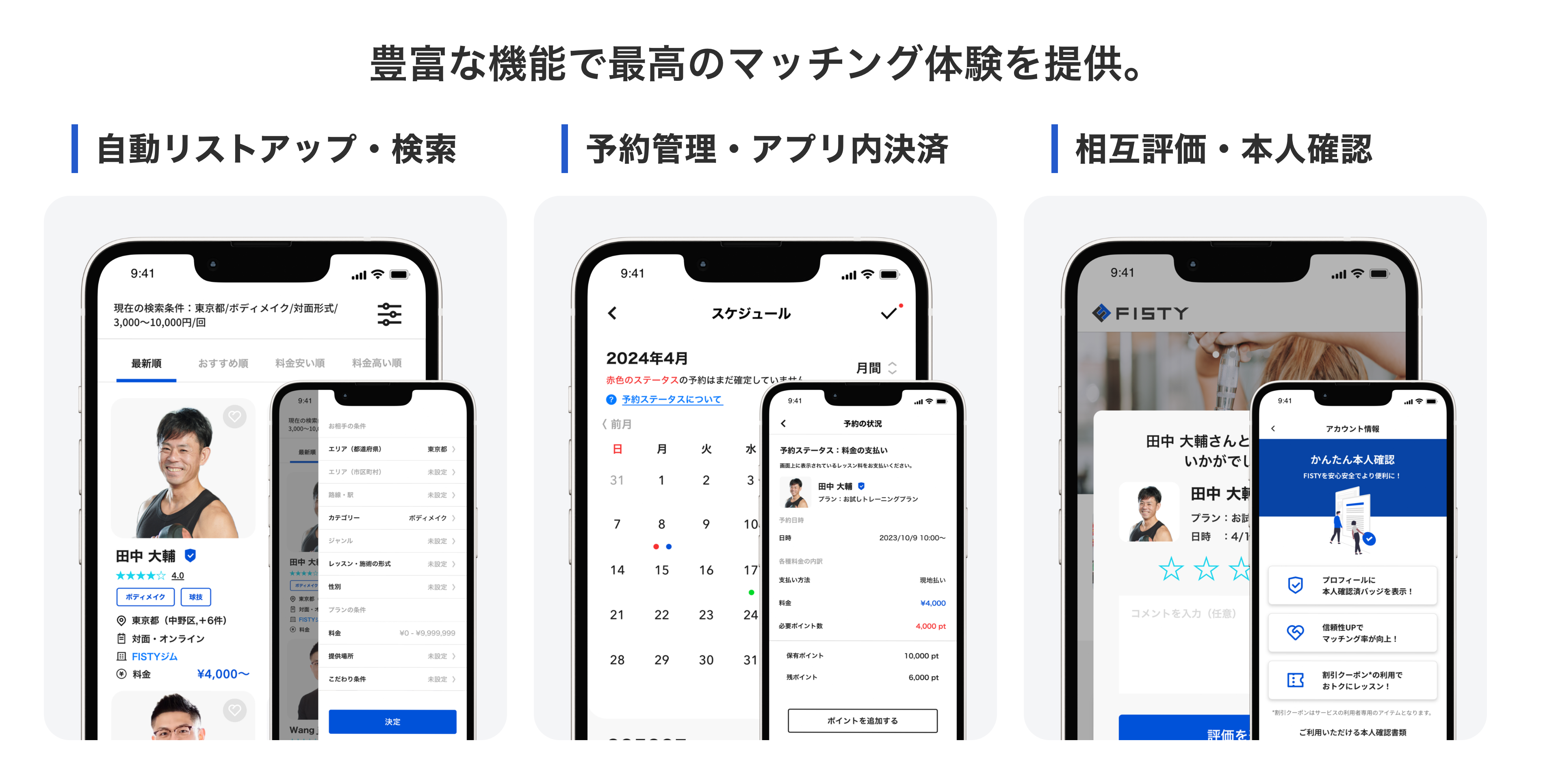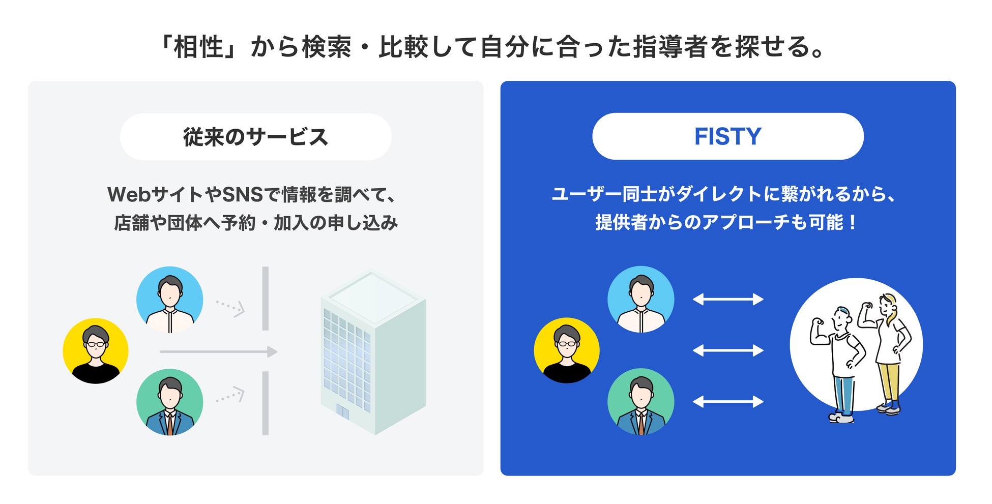 FISTY(フィスティ)は、健康・スポーツ・トレーニングなど身体に関するサービスの提供者(パーソナルトレーナー、インストラクター、スポーツ教室など)と利用者を最適な条件で結びつける業界初の身体に関連する指導に特化したスキルシェアサービスです。ユーザーがダイレクトに繋がることで、居住地域や生活圏に縛られることなく双方が自分に合ったお相手を相性から検索・比較することができます。