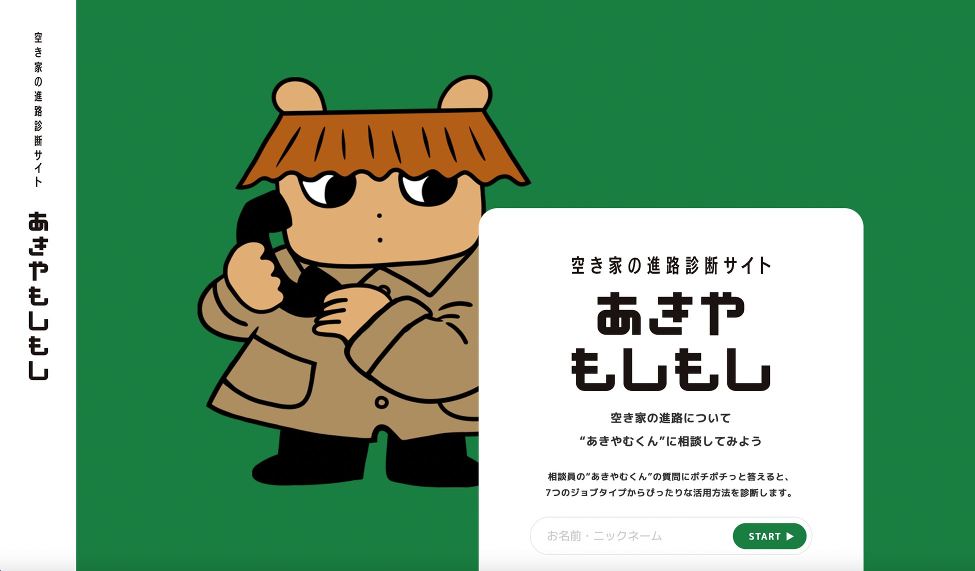 マスコットキャラクターの「あきやむくん」から出される13の質問に答えるだけで、最適な空き家の活用方法を診断します。7つのパターンから最適な活用方法を診断します。