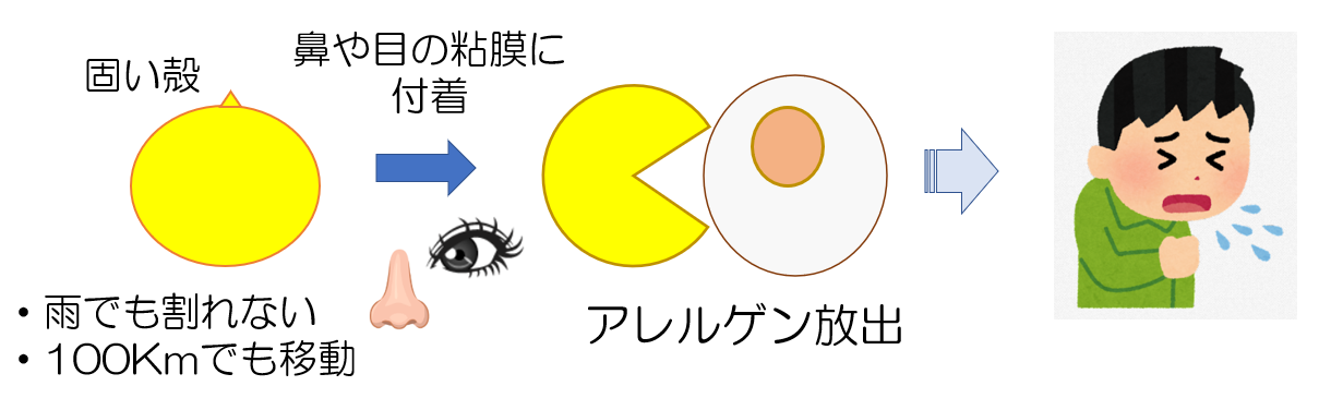 そんなスギ花粉は、固い殻から脱皮して初めてアレルゲンを放出します。