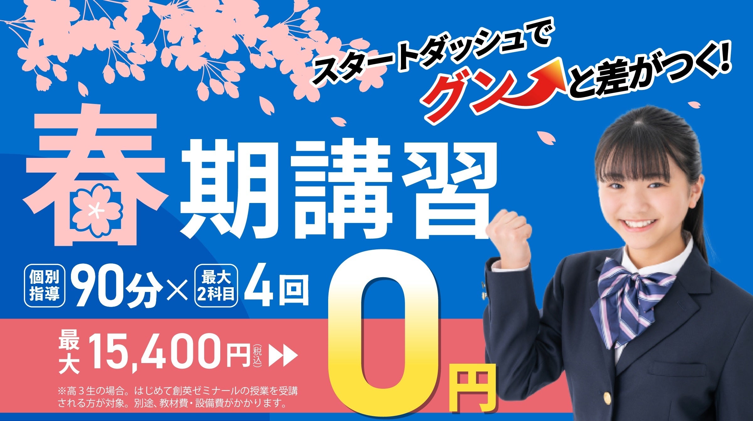 また春期講習だけの期間限定キャンペーンを実施中。春スタートキャンペーンとして4回分の受講料が無料、さらに講習申し込みと同時にご入塾で入塾金が半額、春期講習教材費が無料になります。ぜひこの機会に入塾のご検討をしてみてはいかがでしょうか。