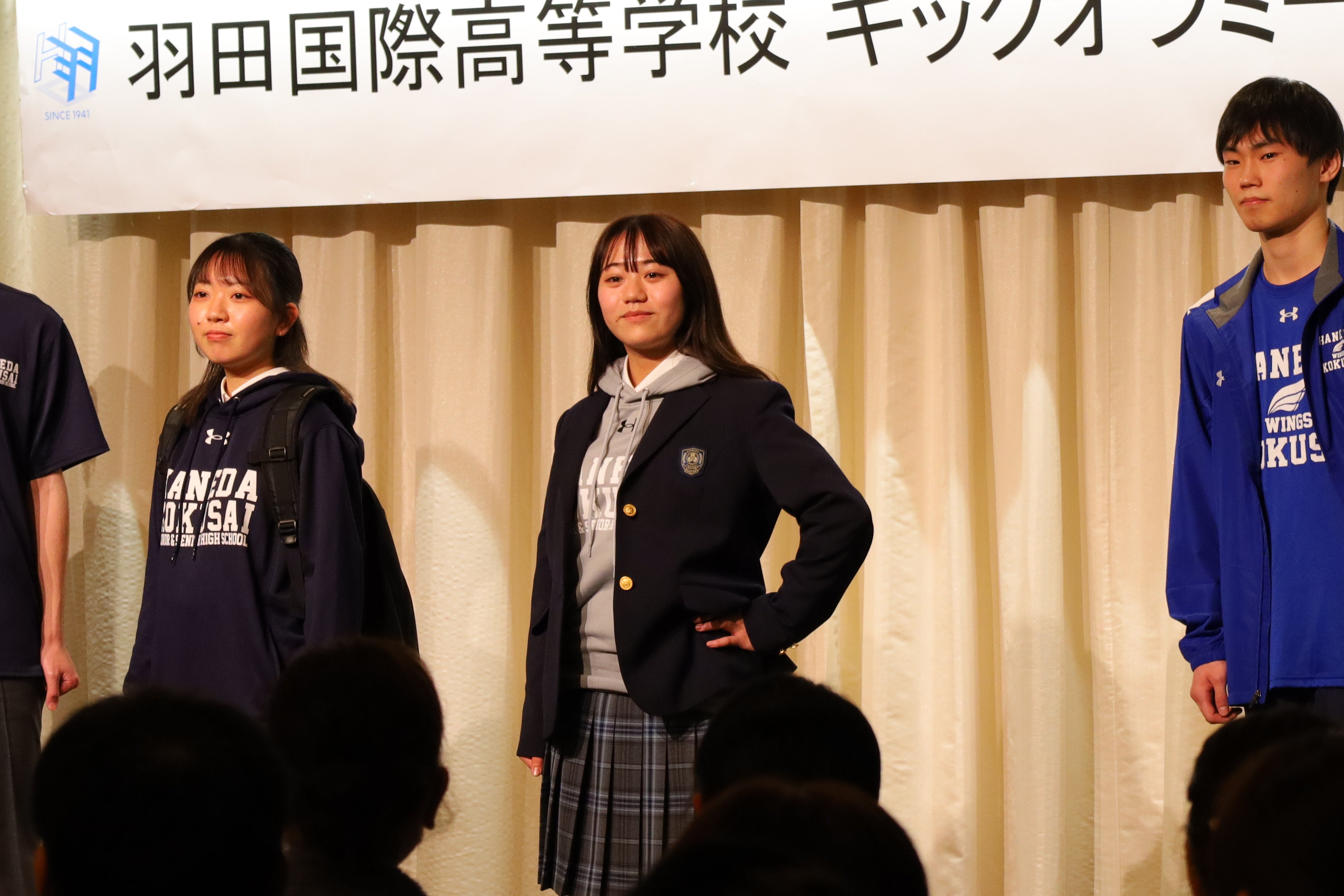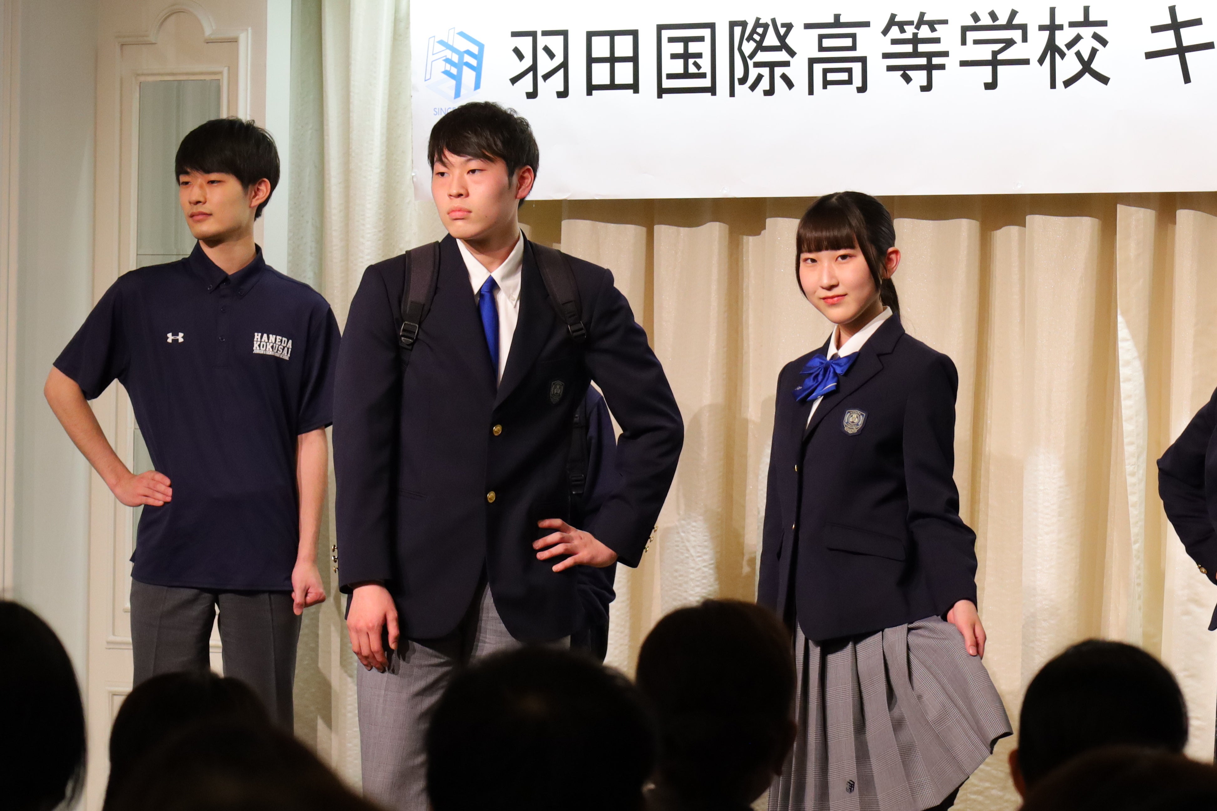 当日は校長の簡野裕一郎より、羽田国際高等学校の教育コンセプトや教育の中心となるGlocalの視点を重視した本校オリジナルのキャリア教育 『Wingsプログラム』 のご紹介、部活動や進路指導、男子の受け入れについての方針とともに、新校への意気込みが語られました。後半は、特色あるプログラムを担当する教職員の紹介に加え、新制服お披露目のミニファッションショーが行われました。これには、地元大田区の日本工学院専門学校 俳優科・声優科の学生さんにご協力いただき、人気のグローバルブランド「アンダーアーマー」製のスポーツアイテムや、制服としては全国的にも珍しい、ブレザーとも組み合わせ可能なパーカー等、多彩なバリエーションを持つ羽田国際高等学校の新しい制服を受験生・保護者様に間近でご覧いただきました。