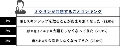 別設問として、オジサン自身に「今の自分が共感すること」について尋ねたところ、「家族とのコミュニケーション」にまつわる項目に回答結果が集まりました。