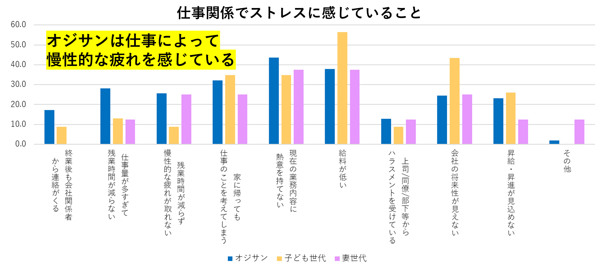 「どのようなことがストレスになっていますか。」という質問を投げかけたところ、他の世代と比較するとオジサンは比較的どの項目においても回答率が高く、注目すべきは40%以上が仕事に熱意を持てておらず、長時間労働による疲れに苦しんでいることが判明しました。