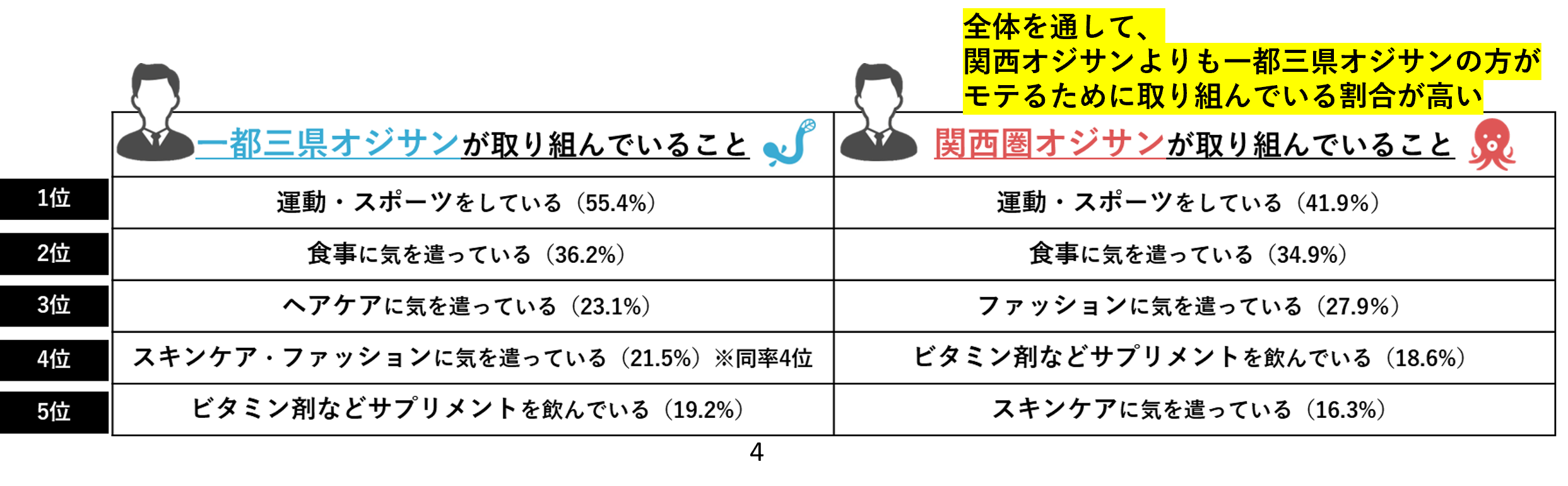 モテたいオジサン(モテたいと強くそう思っている、ややそう思っていると回答した方)に、「若々しくいるために、普段していることはありますか。」と質問したところ、全体では第一位「運動・スポーツをしている(48.6%)」、第二位「食事に気を遣っている(35.5%)」、第三位「ファッションに気を遣っている(24.7%)」という結果になりました。
