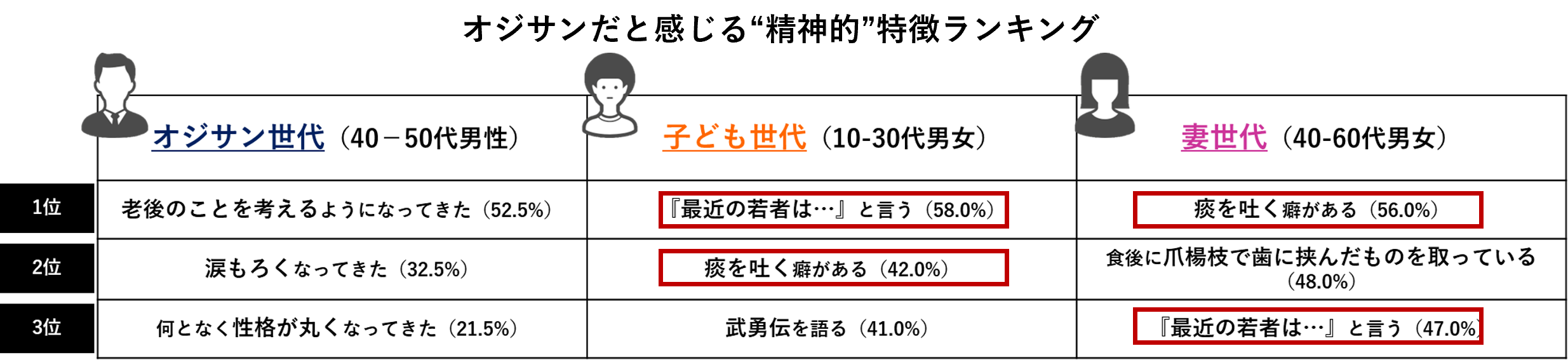 オジサン自身は、オジサンの精神的特徴を「涙もろい」や「性格が丸くなった」とポジティブに捉えている傾向が強いと見受けられますが、子ども世代と妻世代では共通して「痰を吐く癖」や「若者の批評」に回答が集まる結果となり、認識のズレが見られました。