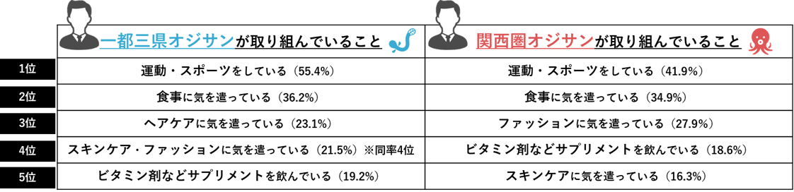 地域別で見ると、一都三県オジサンの方が関西圏オジサンよりも見た目をケアしている人の割合が9.2%多く、若々しく見えるオジサンが多いかもしれません。