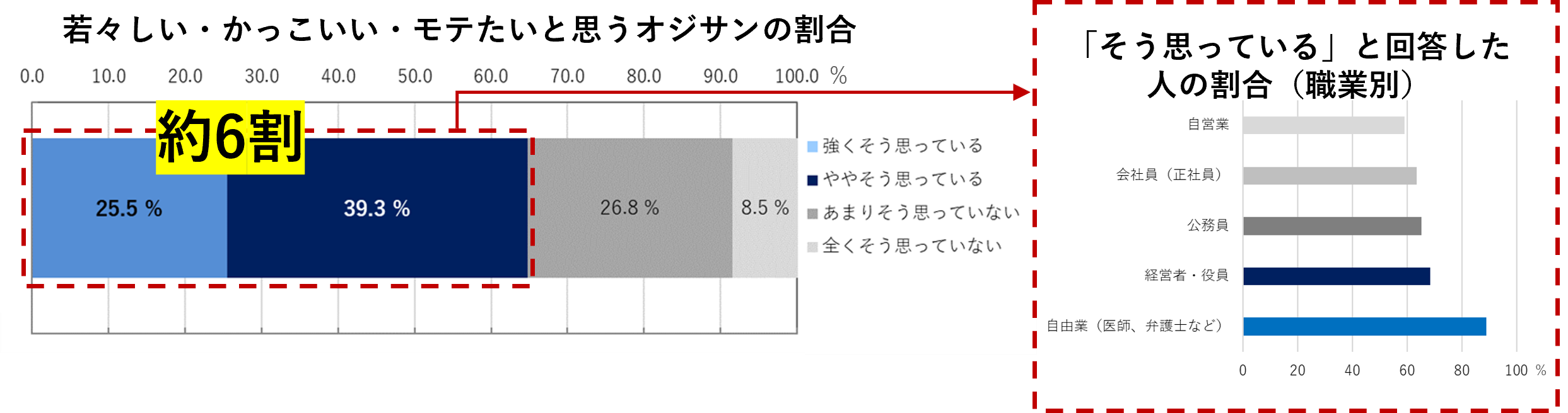 一方で、「オジサンになったと感じてはいるものの、 現在も『若々しい・かっこいいと思われたい』または『モテたい』と思いますか。」という質問に対しては、約6割がそう思っていると回答し、職業別でみると自由業(医師、弁護士など)と経営者・役員が最もその割合が高いと分かりました。