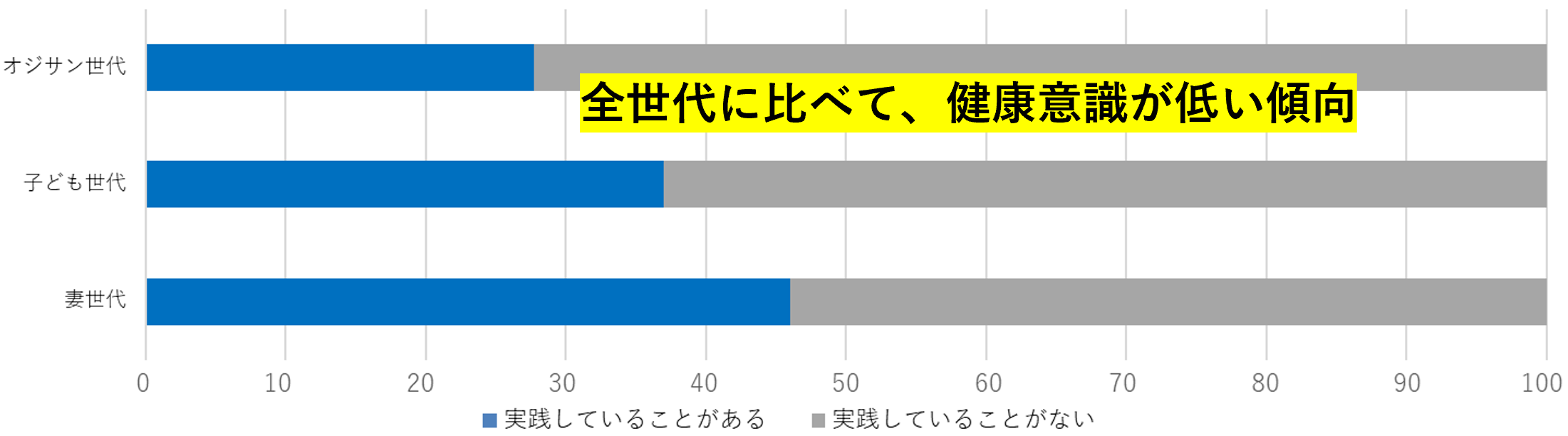 「将来の健康のために何か実践している人」の割合では、一都三県の子ども世代・妻世代は37.0%、関西圏の子ども世代&妻世代は46.0%でしたが、オジサンは一都三県32.0%・関西圏23.5%と、いずれも他の世代より低い数値で、健康意識にギャップが見られました。