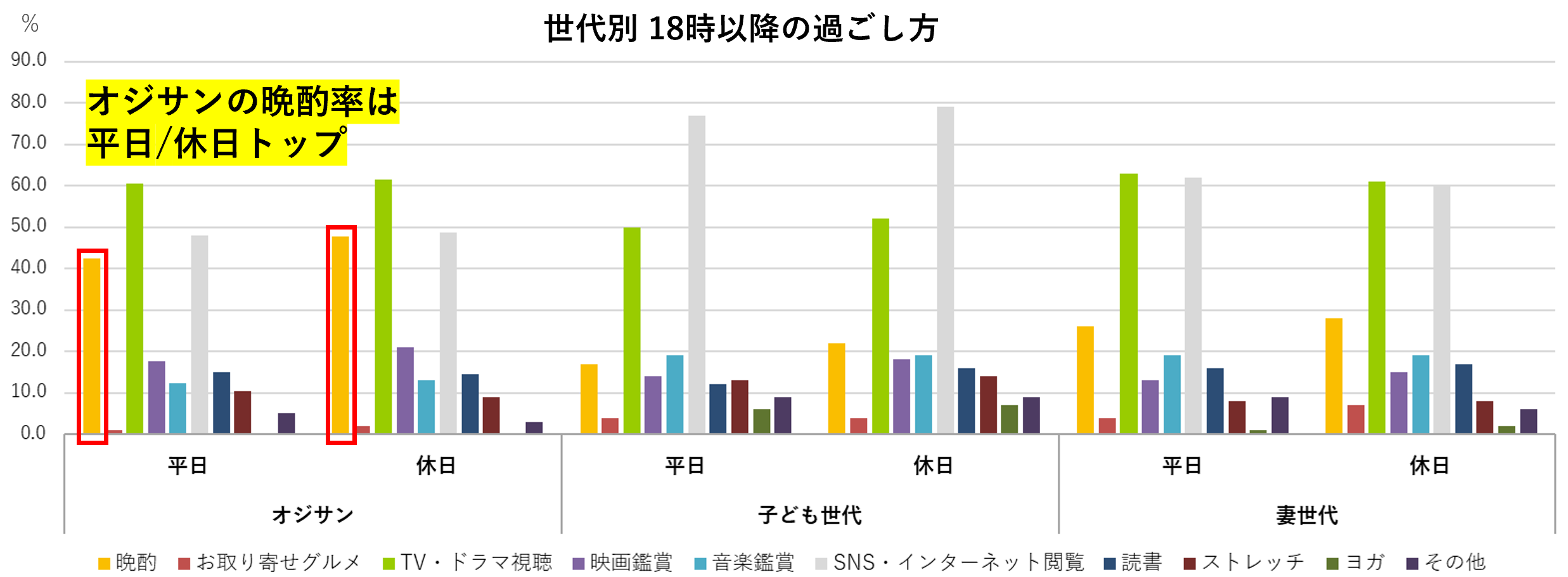 「晩酌」の有無については、若年層の「お酒離れ」を感じる結果となり、子ども世代「平日17.0%、休日22.0%」・妻世代「平日26.0%、休日28.0%」に対して、オジサンは「平日35.5%、休日40.2%」と回答し、家族とは異なり飲酒習慣の定着率に違いが見られました。