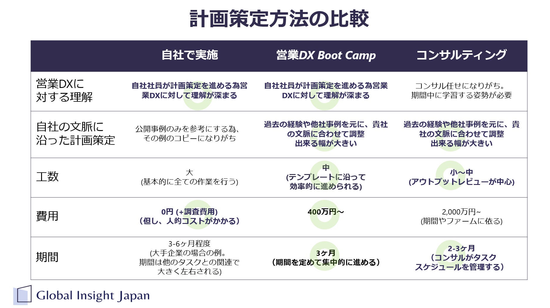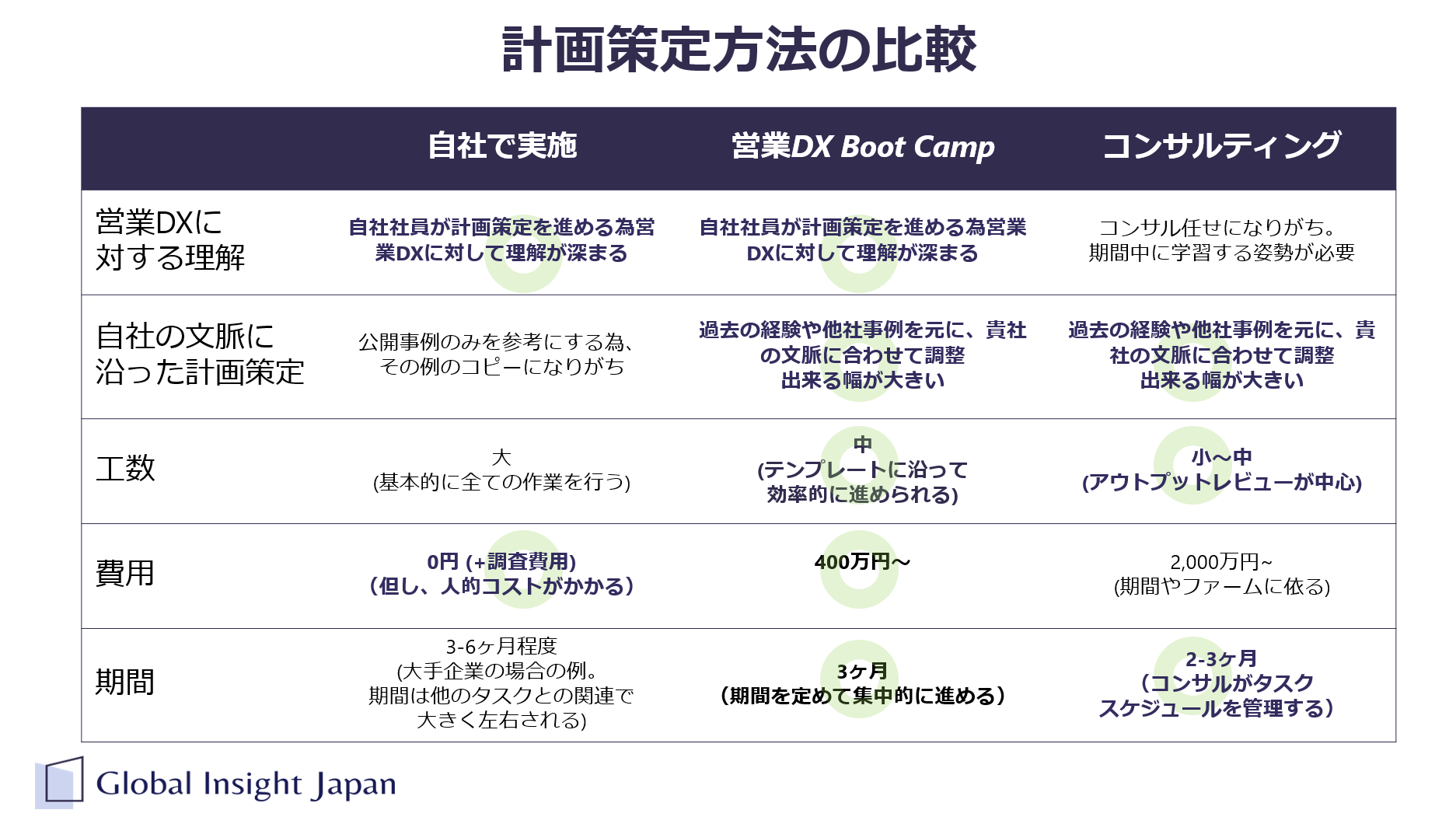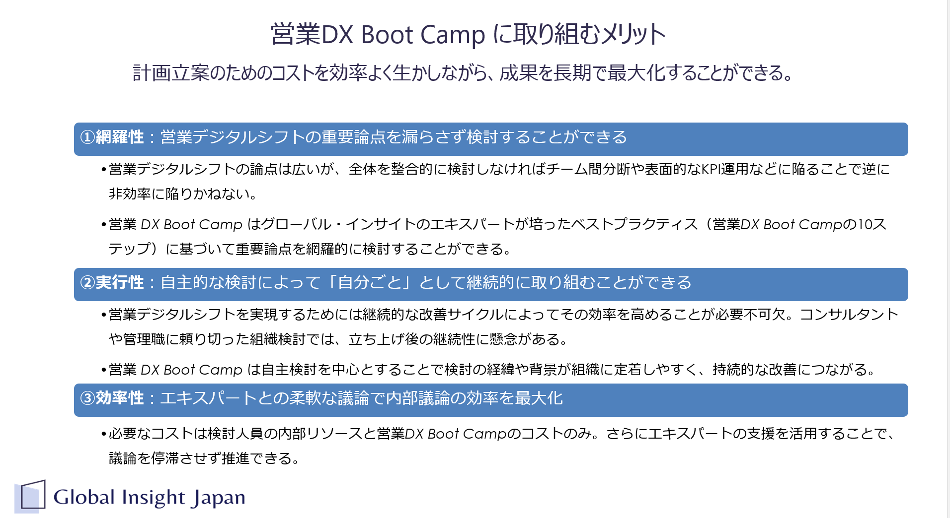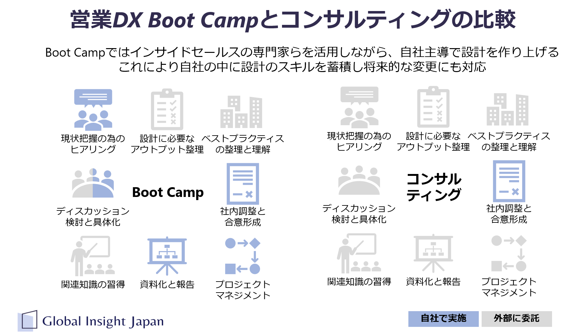 GIJは、「世界標準の売れるしくみを、もっと当たり前に」というミッションを掲げ、企業の営業活動の戦略策定と実行のためのトレーニングとコンサルティングを提供する会社です。「営業DX Boot Camp」は、従来のトレーニングやコンサルティングとは異なる自律伴走型の営業DX計画作成サービスです。このサービスは、自社で営業DXを進めることが困難であり、またコンサルティングに委託してはコストパフォーマンスが合わない企業に対してコンサルティングと比較して数分の一というリーズナブルな価格で提供されます。