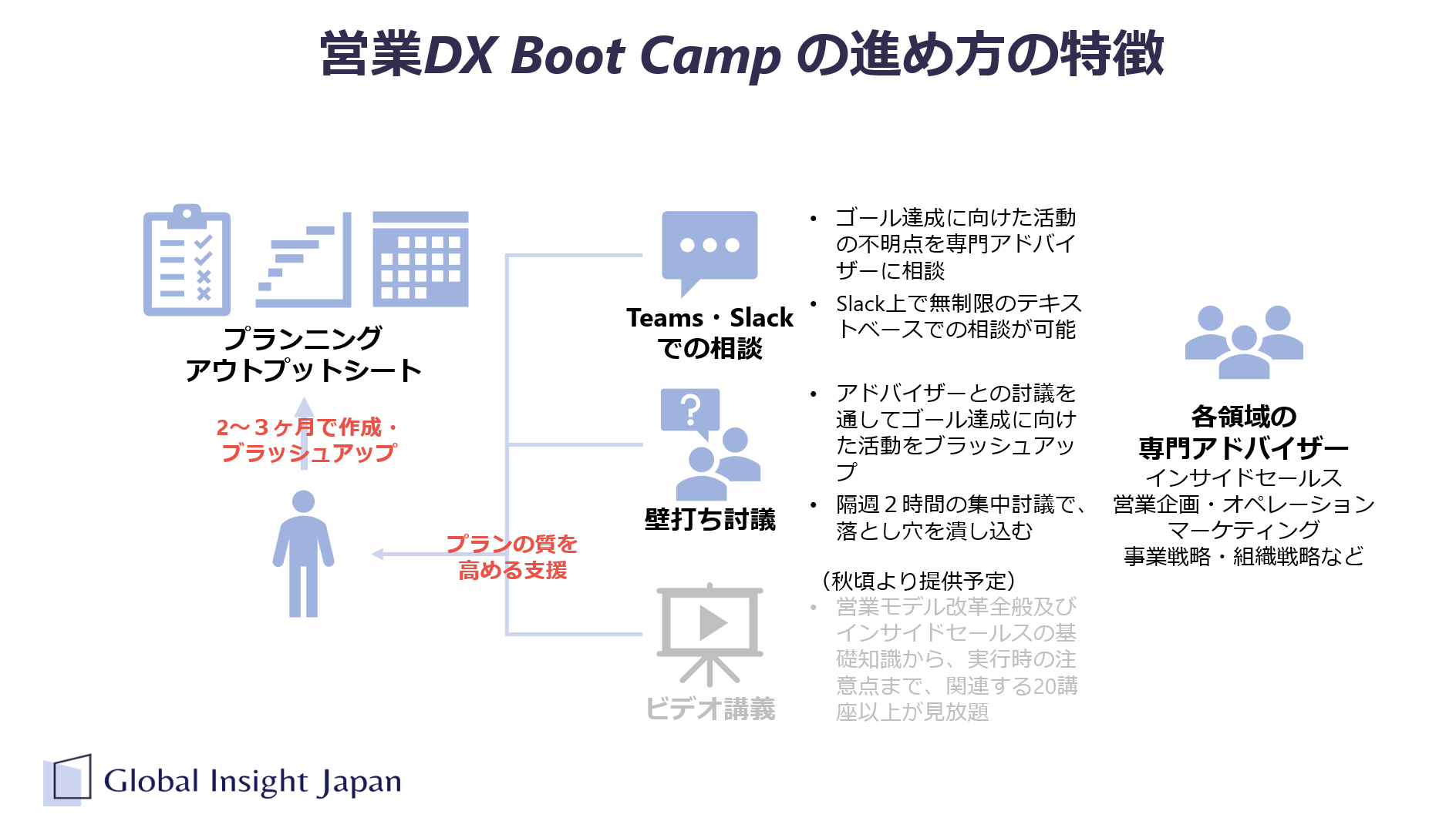 「営業DX Boot Camp」は、隔週のグループ討議と継続的なTeamsやSlackを使ったコミュニケーションにより、最短2~3か月で営業デジタルシフトの改善に向けたアウトプットシートを完成させます。参加者と共に、GIJのエキスパートと緊密に連携しながら、確実に改善に向けたアクションを遂行します。