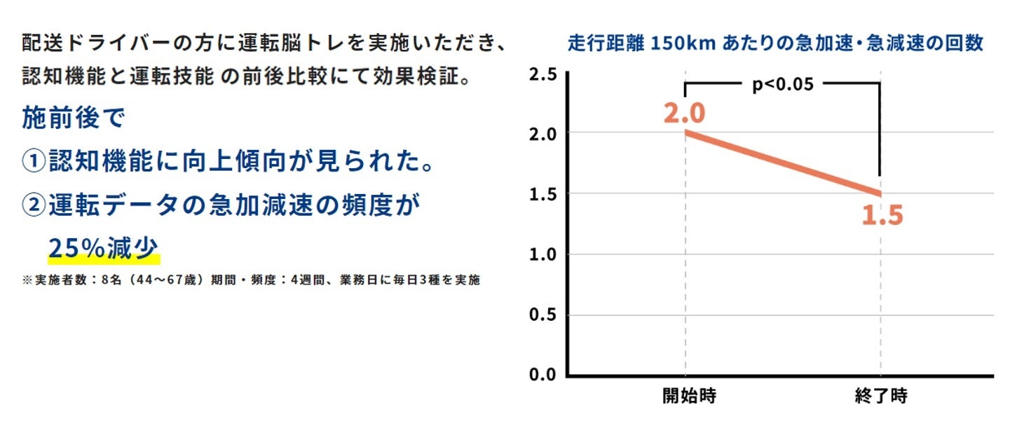 当社の「運転脳トレ」を配送ドライバー8名(44~67歳)に1ヶ月間実施していただき、認知機能と運転技能の前後比較を行った結果、以下のような結果が得られました。