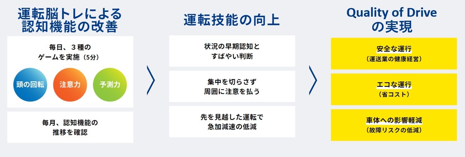 運転脳トレは当社CTOの川島隆太博士が脳科学の知見およびエビデンス基づき開発を行っており、脳トレによりQuality of Drive(運転の質)が変化することで安全運転だけでなくエコドライブなどにも効果が期待できます。