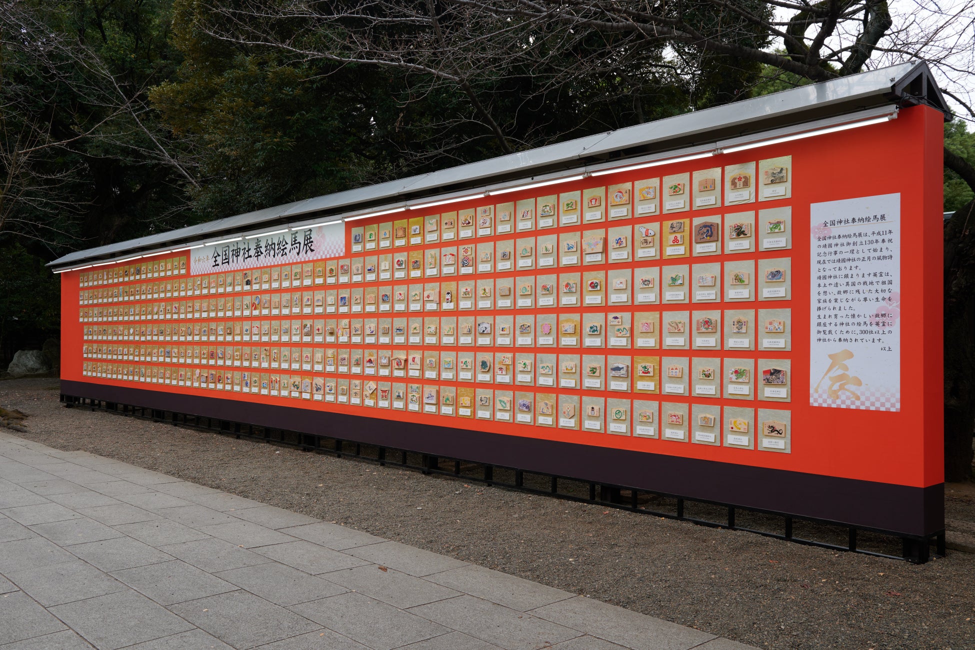 全国各地の約300の神社から縁起絵馬が奉納され、境内に飾られます。平成11年(1999年)の靖國神社創立130年を記念して始まりました。大きさや形もそれぞれで、干支や花、宝船などの絵が色とりどりに描かれています。