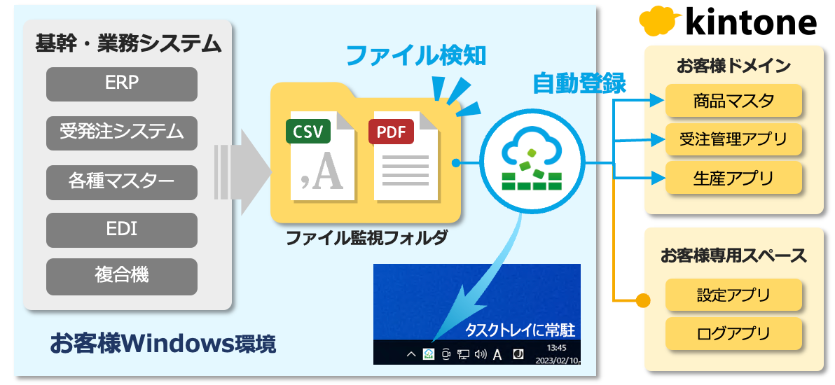 DataSyncer for kintone(データシンカー)は基幹・業務システムから出力されるCSVデータおよび複合機などから出力されるスキャンやFAXのPDFファイルをkintoneに自動連携(ゼロタッチ連携)するサービスです。 https://datasyncer.craftex.co.jp