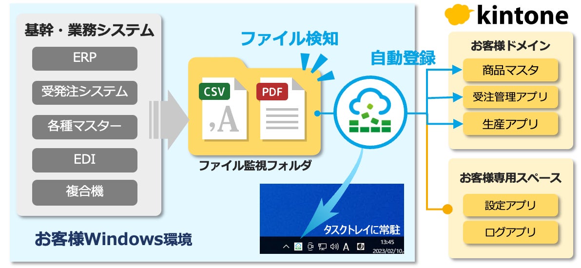 Windows OS上でアプリが常駐稼働することで、オンプレミスの業務データをシームレスにkintoneに連携することができます。またデータ連携ツールとしては安価な価格(年額99,000円 税込)で利用できることから、企業規模に関わらず手軽にデータ連携を実現できるツールとして中小企業を中心に導入が進んでいます。