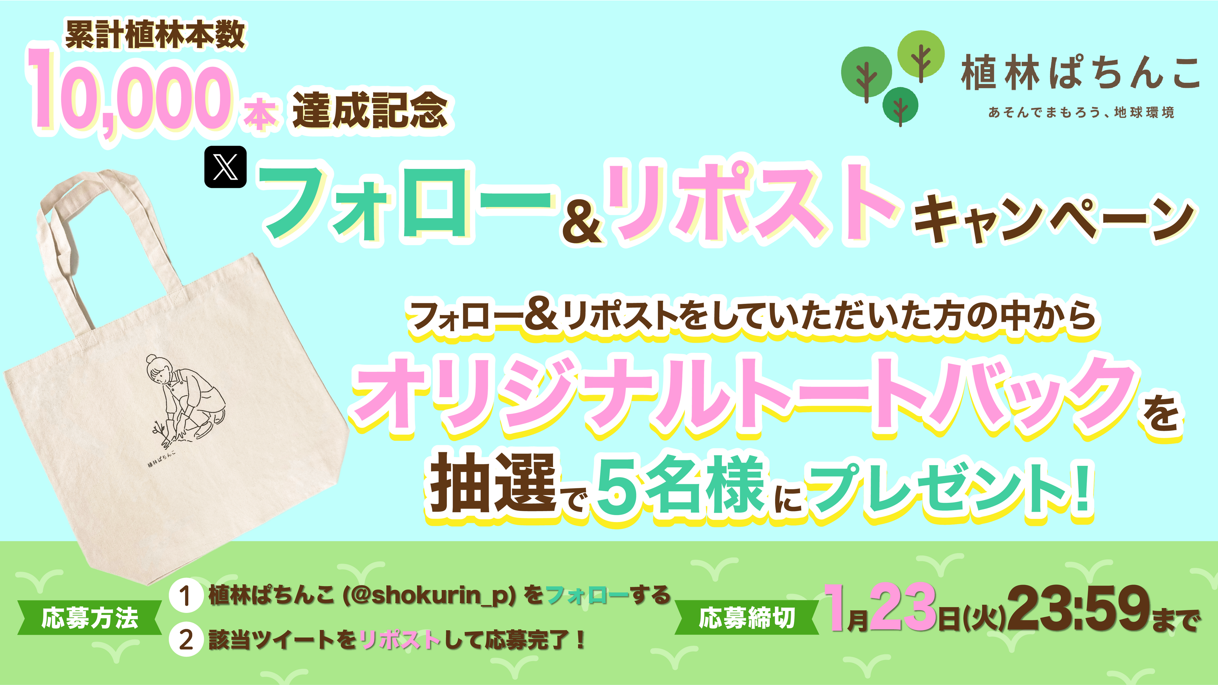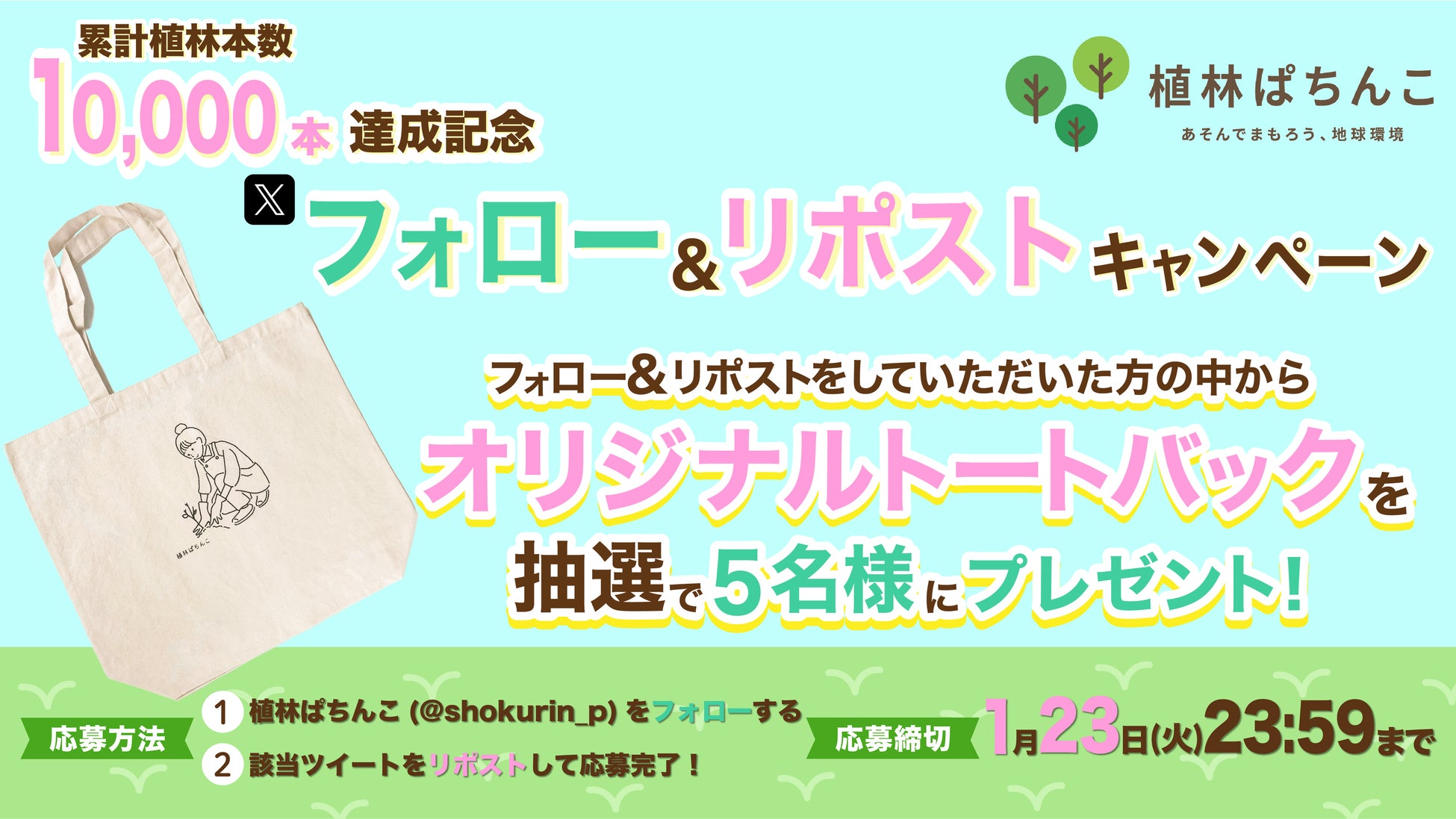 植林ぱちんこ公式X (旧Twitter)「@shokurin_p」をフォローして、対象ポストをリポストすると抽選で5名様に植林ぱちんこオリジナルECOトートバックをプレゼント!