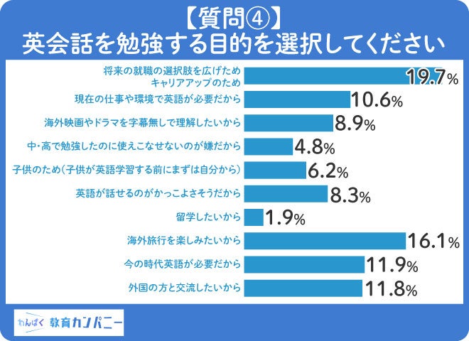 「英会話を学習する目的」に関するアンケートの結果として、19.7%がキャリアアップのために英会話を学習していると回答しました。
