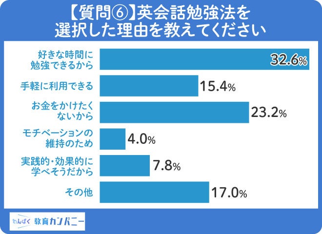 英会話の学習方法を選んだ理由についてのアンケートによると、「好きな時間に勉強できること」だと答えた方が32.6%いました。
