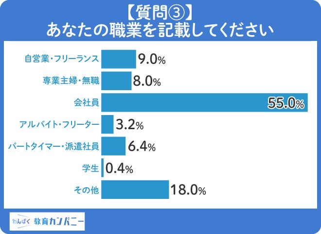 回答者の職業に関するアンケートでは、会社員の方の割合が55.0%と半数以上となりました。