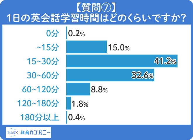 一日の英会話学習時間についてのアンケートでは、41.2%が一日に「15~30分」英会話の学習をしていると回答しています。