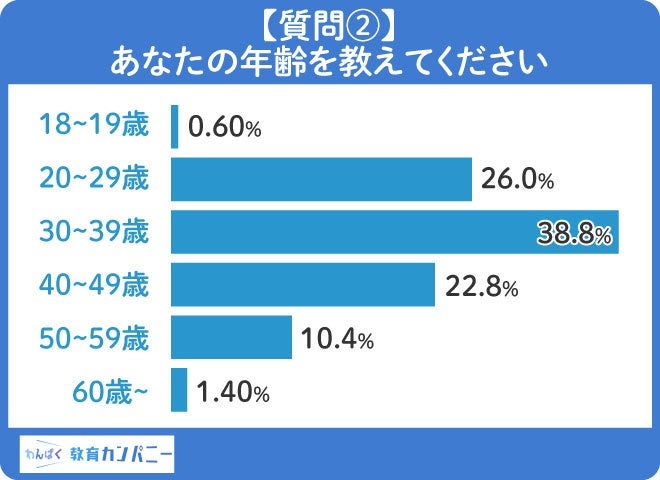 回答者の年齢に関するアンケート結果として、38.8%が「30〜39歳」と回答しました。