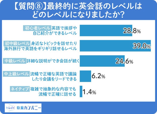 【質問⑧】最終的な英会話レベルの第一位は「身近なトピックを話せたり海外旅行で英語をギリギリ話せるレベルの初~中級レベル」
