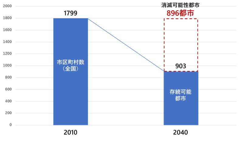 2040年には全国の市町村の約半分が消滅可能性都市(2010年から2040年にかけ、20~39歳の若年女性人口が5割以下に減少する市区町村)に該当し(下記図参照)、その大半が地方の市区町村であると予測されています。