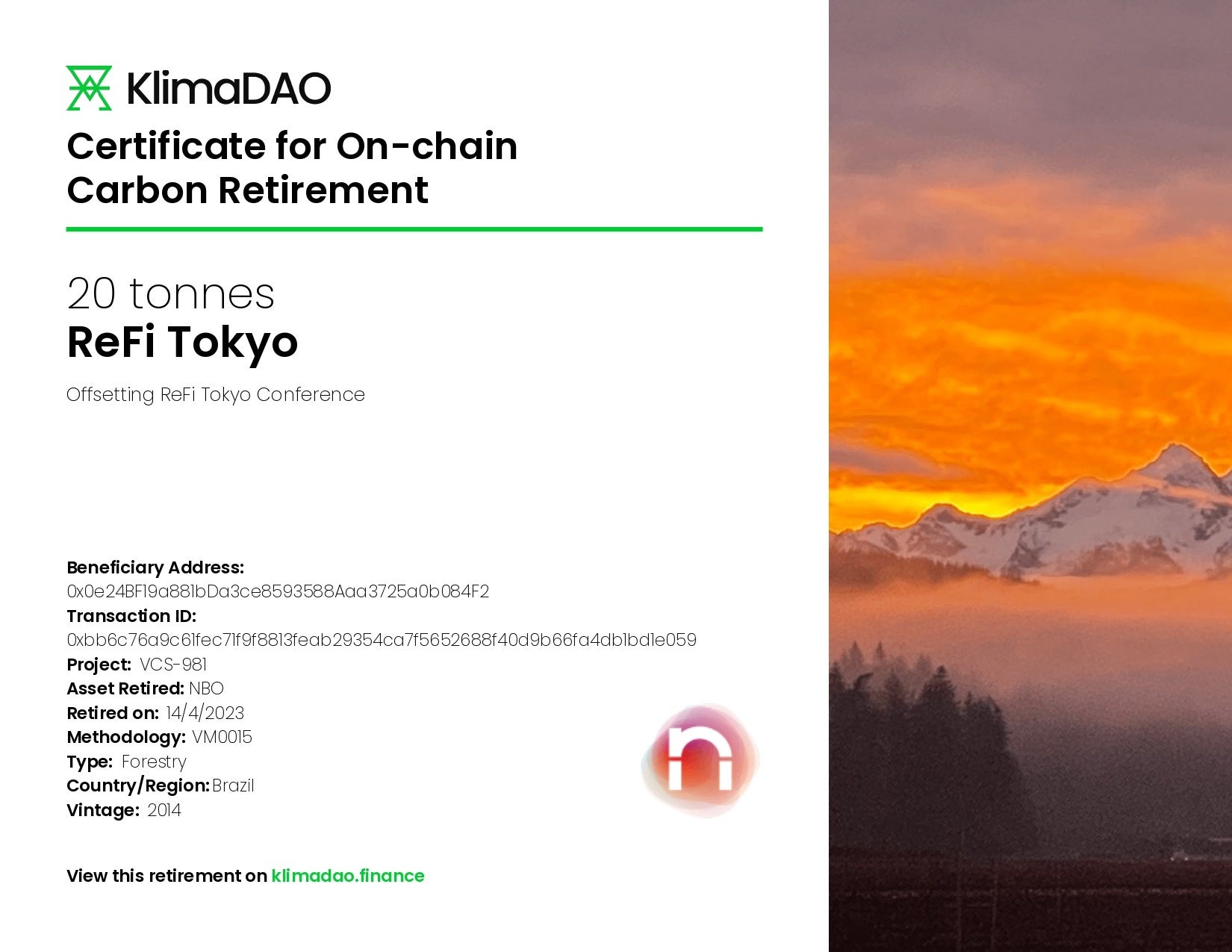 また、ReFi TOKYOの実施に伴い排出されたCO2排出量(推計値:約20トン)を本イベントのスポンサーであるKlimaDAOが提供するサービスを活用してオフセットし、カーボンニュートラルなイベントを実現いたしました。