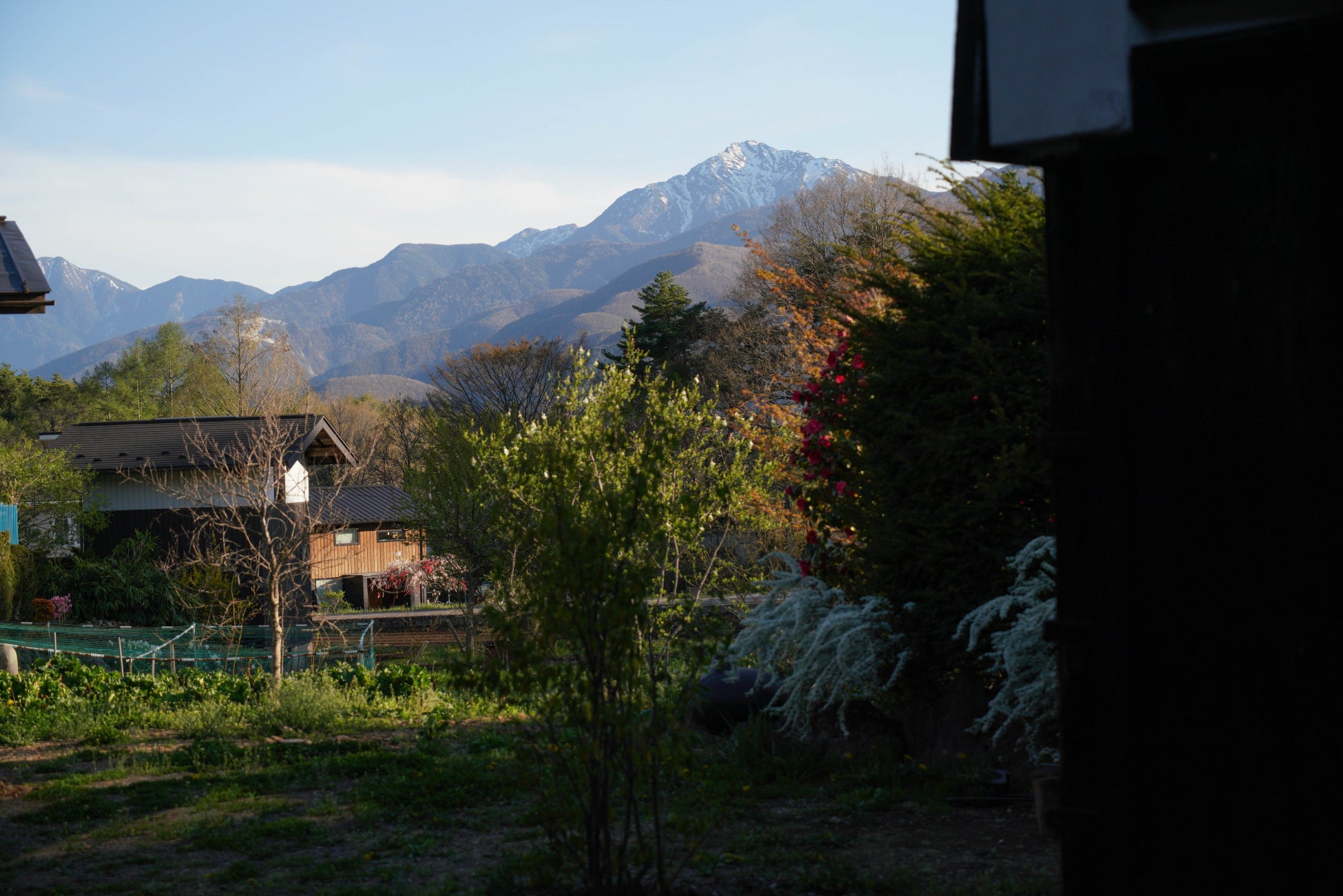 畑と庭の背景に南アルプスの甲斐駒ヶ岳を望むことがき、庭の奥にある丘へ進むと八ヶ岳も一望出来るため、マウンテンビューの滞在をお楽しみいただけます。