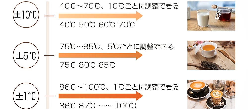 コーヒーを淹れる際にはお湯の温度が極めて重要で、温度に応じてコーヒーの風味(酸味、苦味、香りなど)も変わります。HAGOOGI電気コーヒーケトルは高精度NTCセンサーを搭載しており、様々なニーズに合わせて40℃から100℃まで温調可能です。