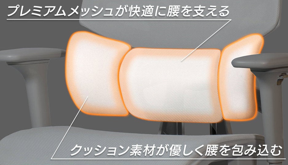 人間工学に基づいて開発された腰を包み込む形状が特徴の3ゾーンランバーサポートが腰を快適に支えます。