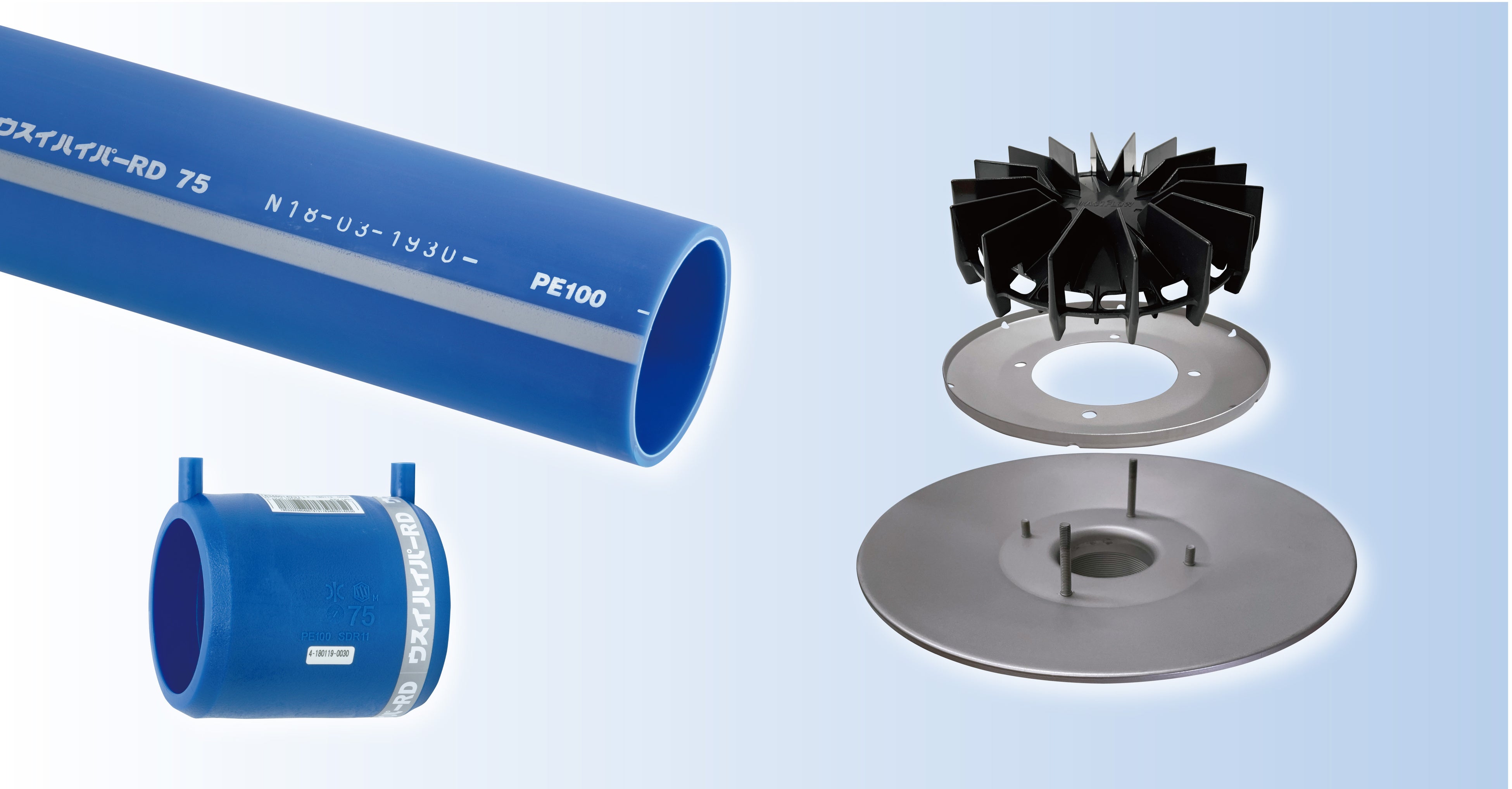 PE 管・PE 継手は、耐腐食性があり、軽量で施工性に優れます。管と継手の接合面は電気融着でポリエチレン樹脂を溶かし、配管を一体化させることで漏水防止が図れます。