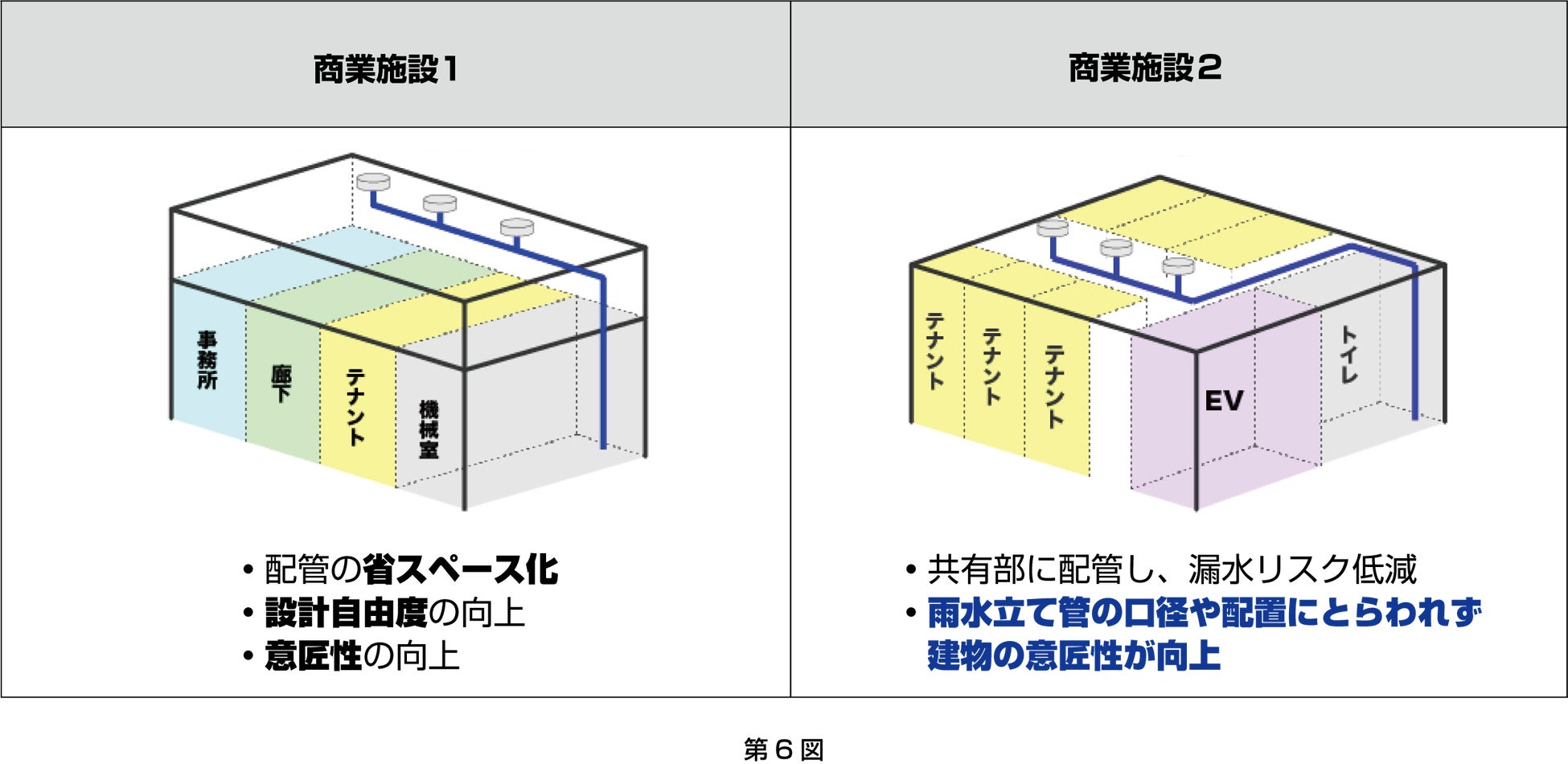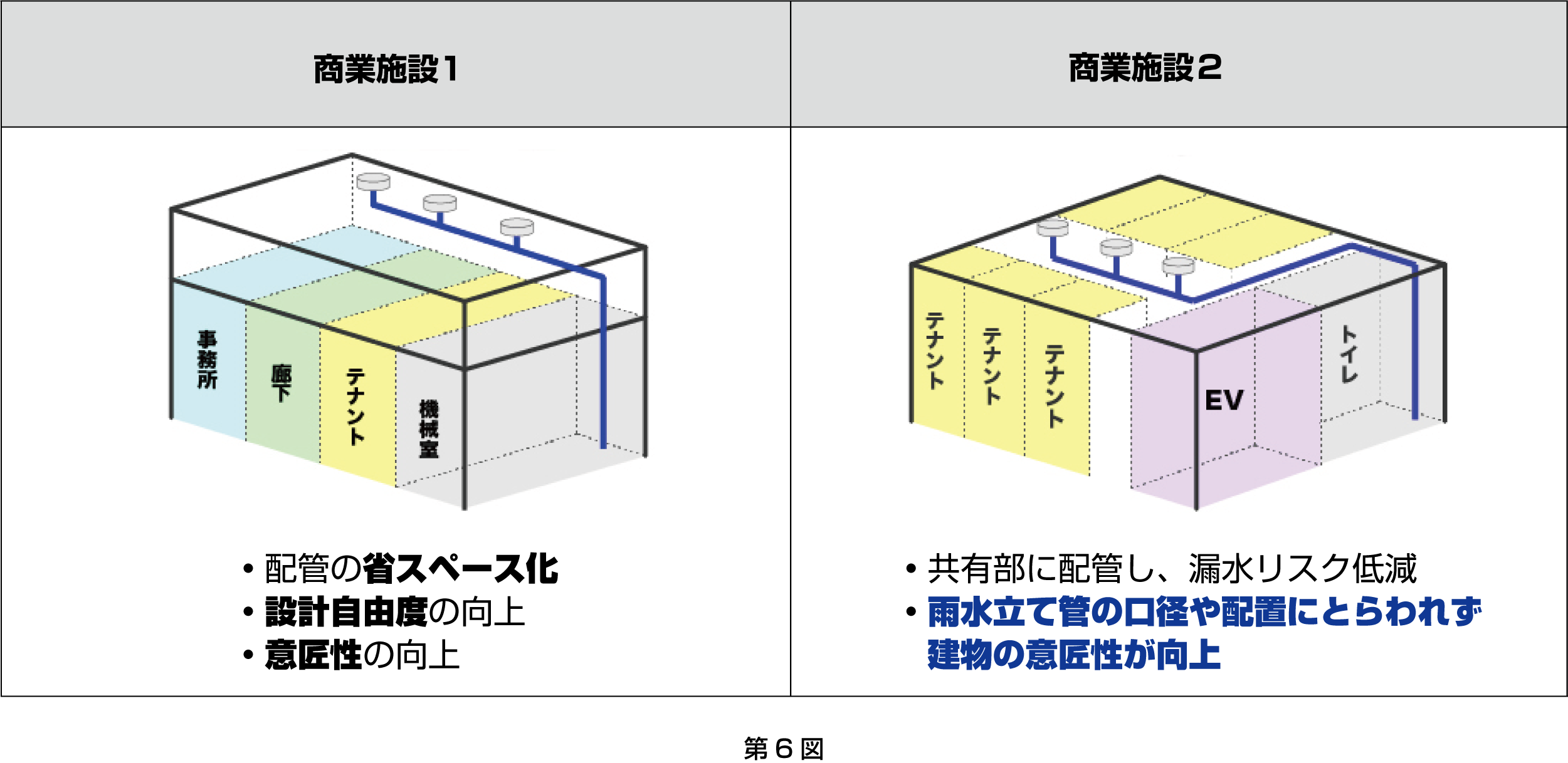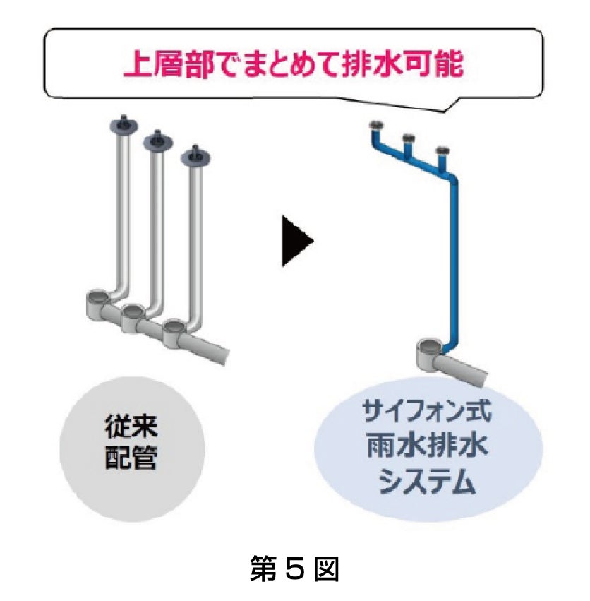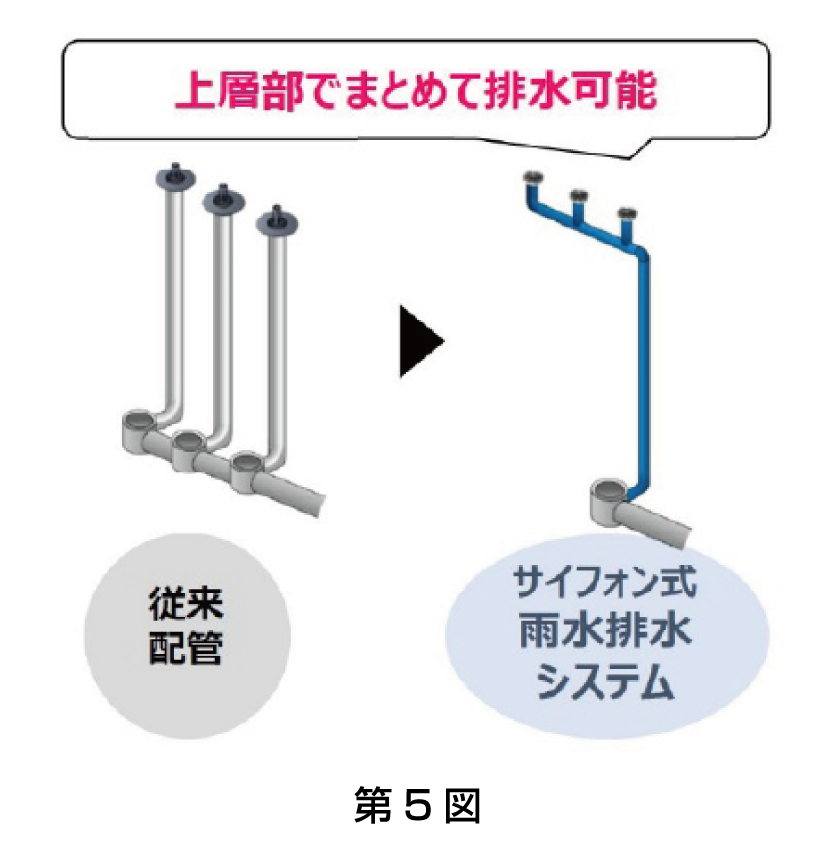 サイフォン式雨水排水システムにより、配管を省スペース化でき設計自由度が向上し、建物の意匠性が向上します。(第6図)