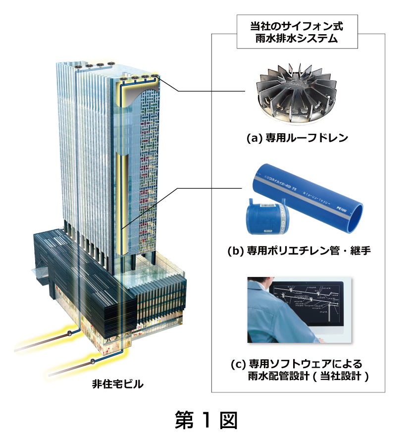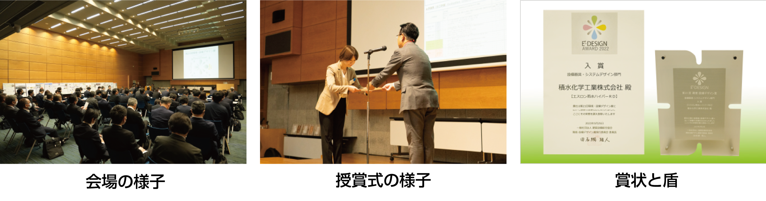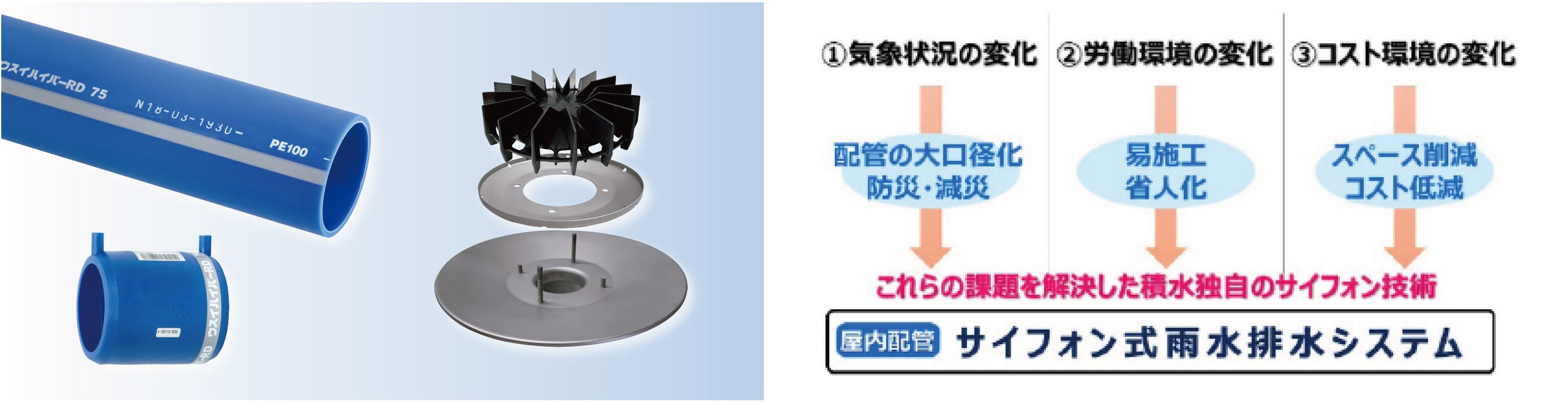 近年は、短時間に猛烈に降る集中豪雨が頻発化し、建物内における雨水排水設計においても、従来以上の降雨強度が求められています。従来の配管設計では、雨水排水立て管の本数の増加や大口径化により対策がなされていますが、「エスロン雨水ハイパーRD」は、サイフォン原理を利用して排水立て管の本数削減や小口径化が図れ、「意匠性」「施工性」「経済性」等の向上に寄与できる点が評価され、今回の入賞となりました。