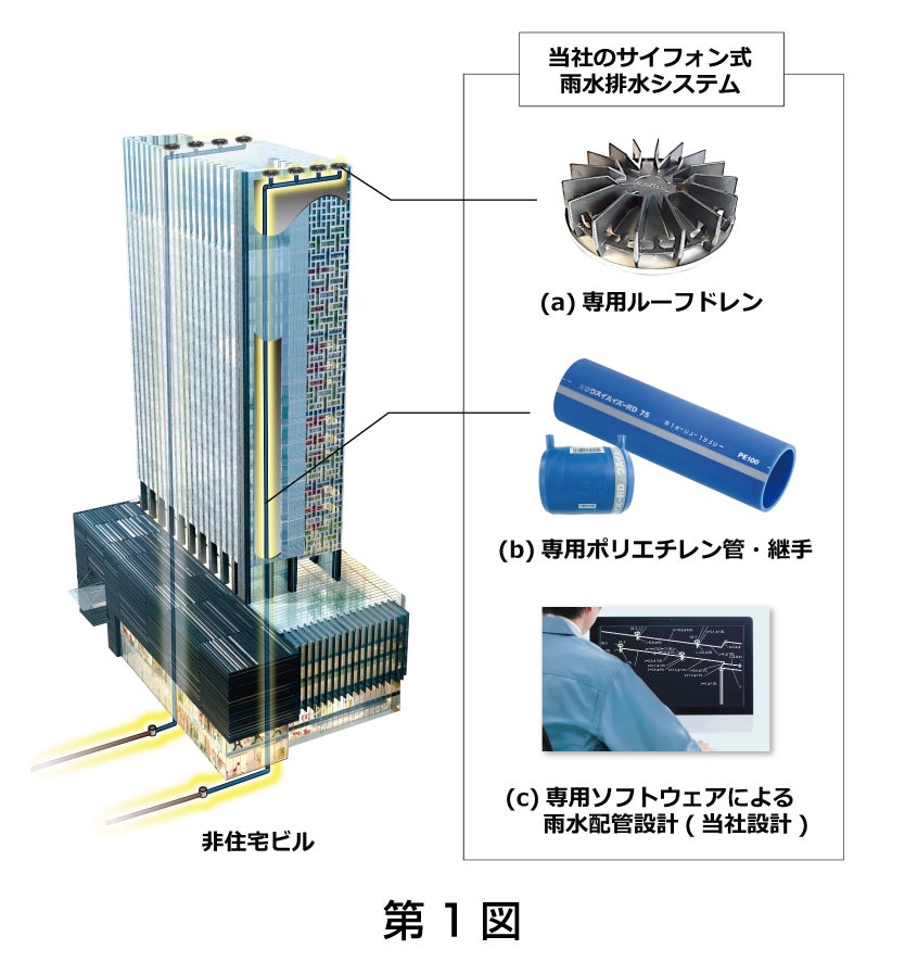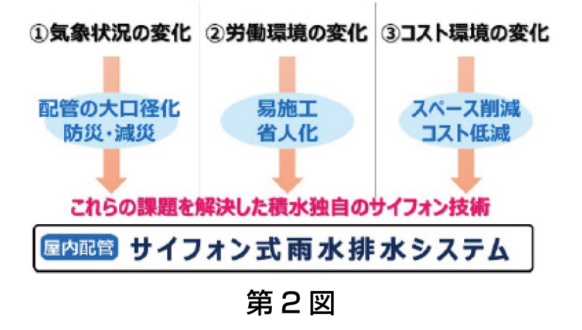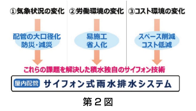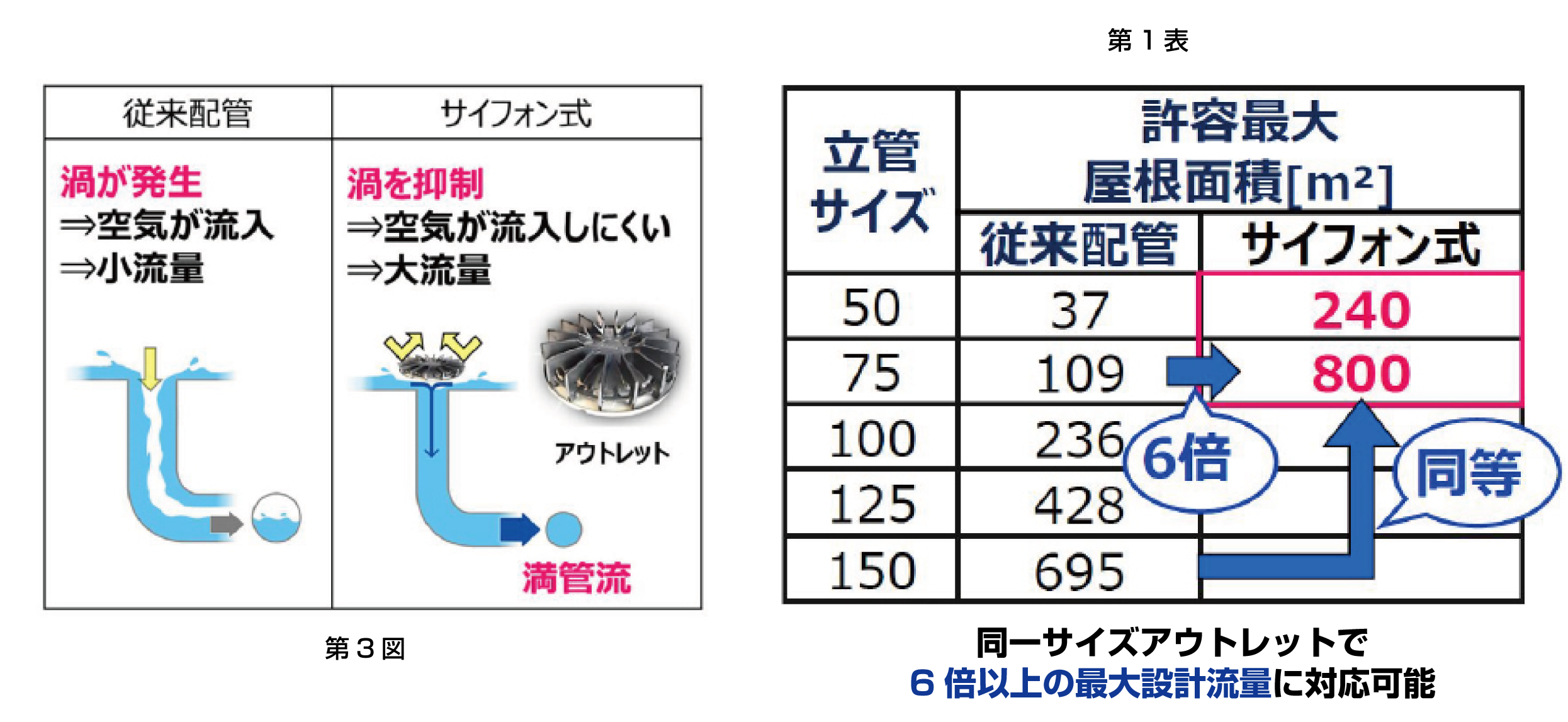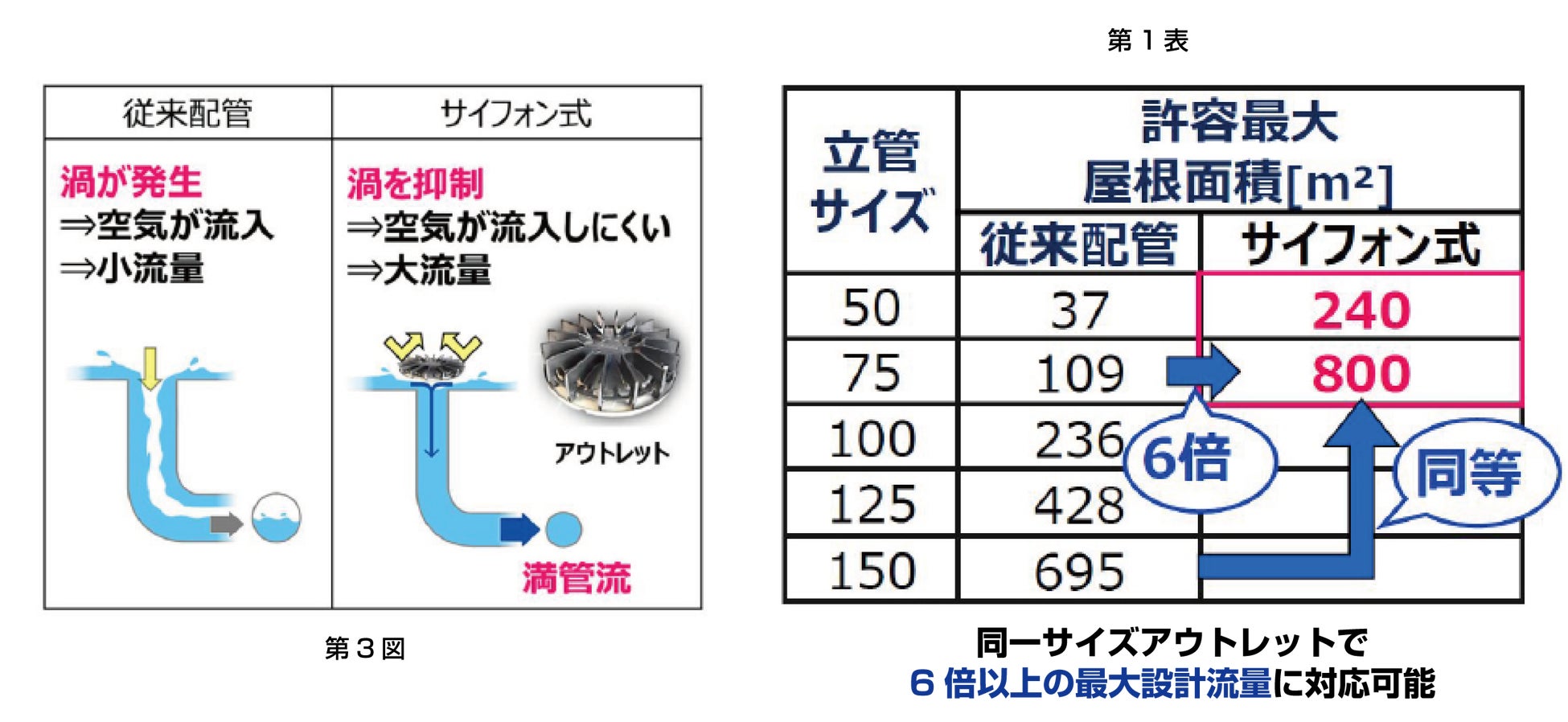そこで、当社ではサイフォン原理を利用して排水立て管の本数削減や小口径化が図れ、「意匠性」「施工性」「経済性」等の向上に寄与できる「サイフォン式雨水排水システム」を紹介いたします。