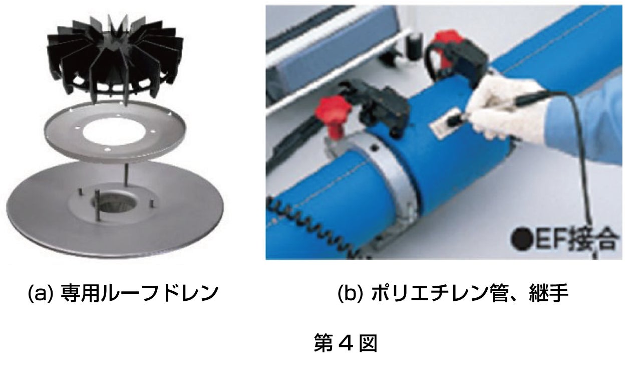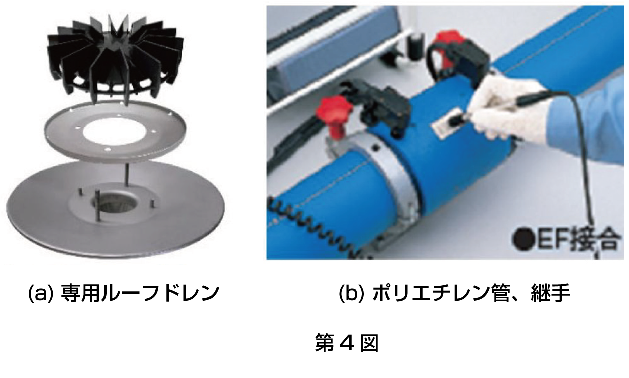 当社のサイフォン式雨水排水システムの部材は、専用ルーフドレン(第4図(a))とポリエチレン管、ポリエチレン継手(以下PE 管・PE 継手という、第4図(b))で構成されています。