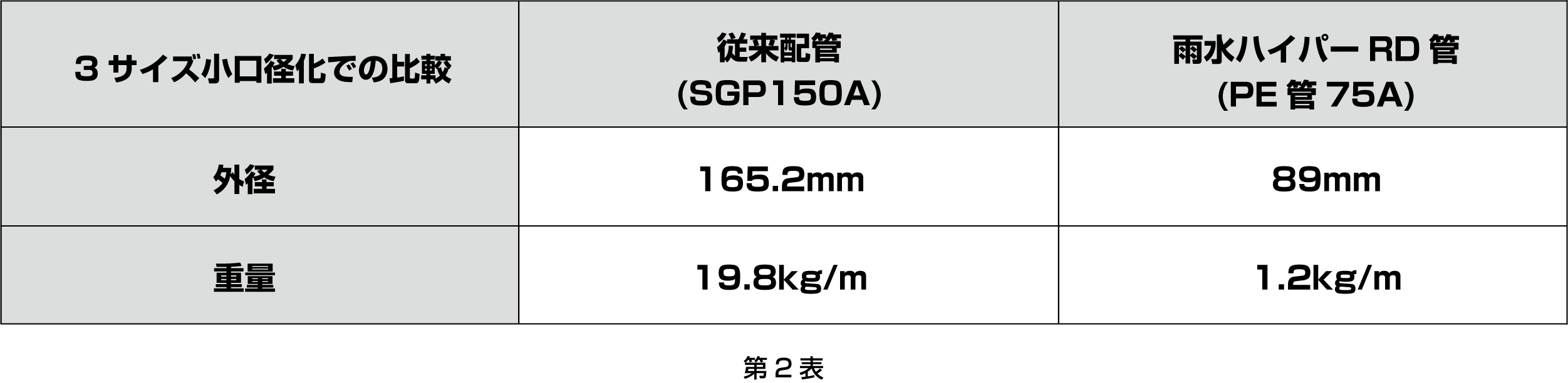 サイフォン式雨水排水システムは、サイフォンにより発生した強い推進力を利用することで、充水率を1.0まで大きくすることができるため、第2表に示す通り、従来雨水排水システムの雨水配管よりも管径を1~3サイズ小口径化でき、重量も従来配管の1/15以下まで軽量化できます。