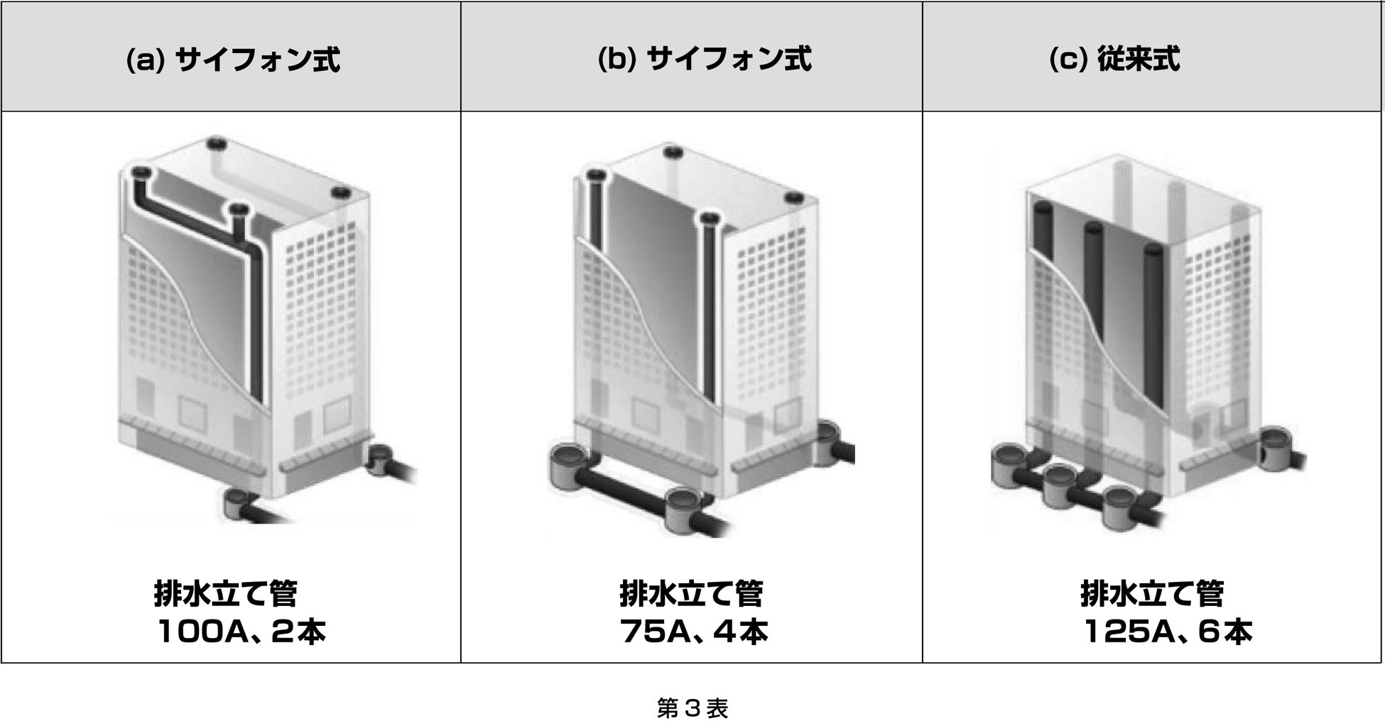 本排水システムと従来式雨水排水システムの適用例を第3表に示します。(c)従来式と比較して、(a)サイフォン式において、雨水配管を屋上スラブの下の横引管で合流させることで排水立て管本数を6本から2本に削減し、管径を1サイズ小口径化できます。また、(b)サイフォン式においては、排水立て管径を2~3サイズ小口径化し、排水立て管本数を6本から4本に削減することもできます。