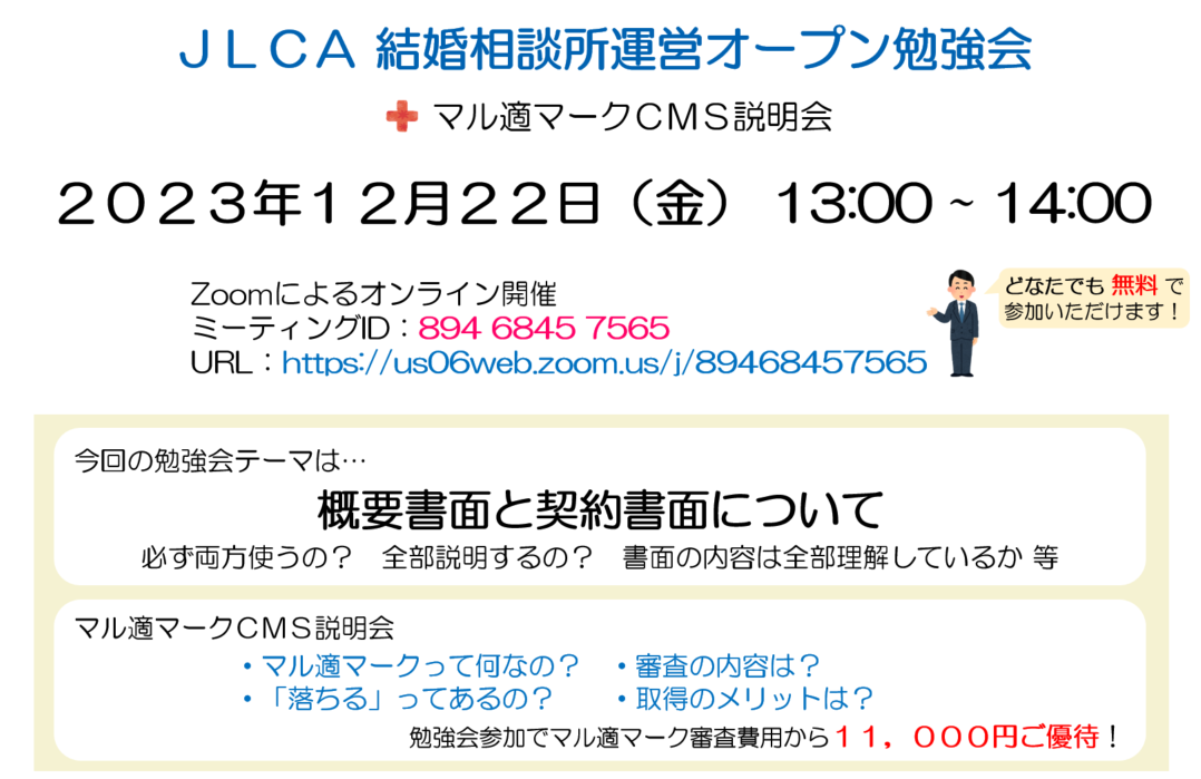 特定非営利活動法人 日本ライフデザインカウンセラー協会は、有識者を交えマル適マークCMSの発行を最終審査する「審査委員会」を11月27日に開催し、今回新たに9つの結婚相談所に認証発行しました!