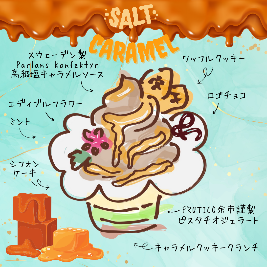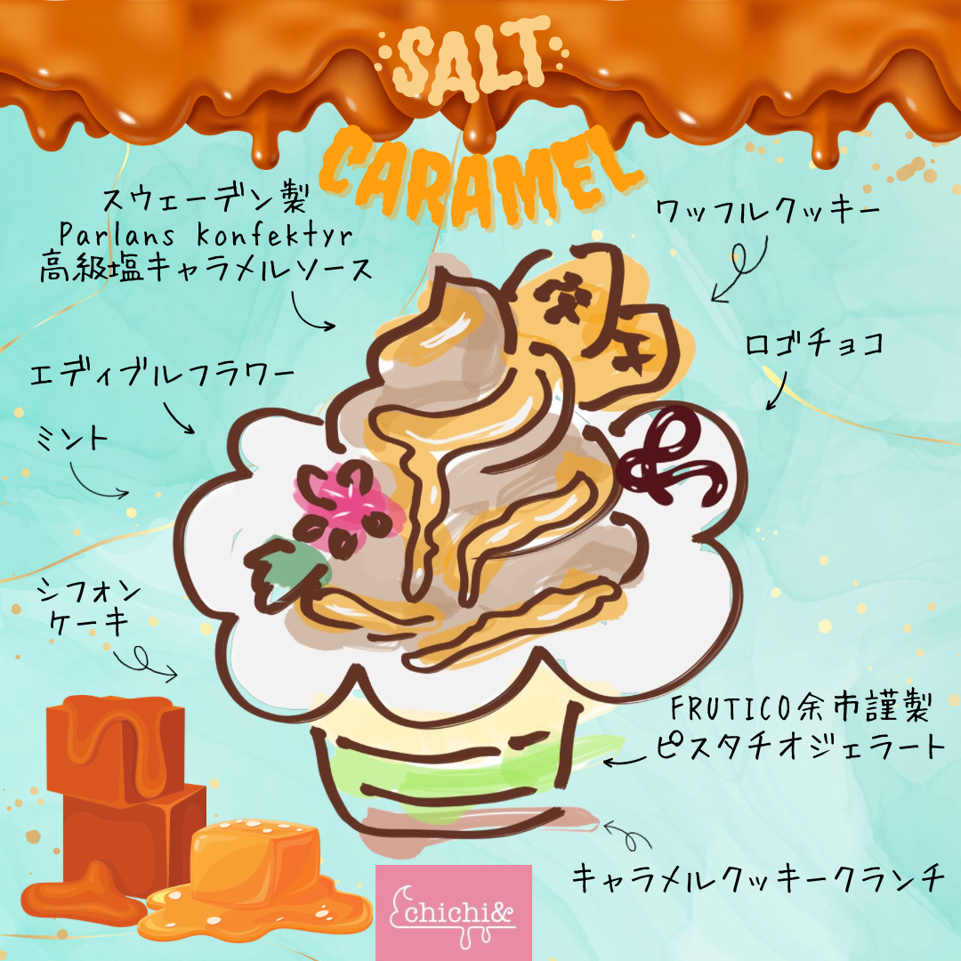 上質な砂糖やマダガスカル産のバニラなど、厳選されたオーガニックな素材のみを使い手づくりにこだわったブランドParlans Konfektyr(パーランスコンフィクティール)のソースを贅沢にchichi&のソフトにかけた、至高の塩キャラメルソフトです。自然で優しい甘さ・味わい。口の中でとろけるようなまろやかでクリーミー&ソフトな触感と、シンプルでまろやかな優しい甘みは、chichi&の最上級ソフトにもぴったりです。