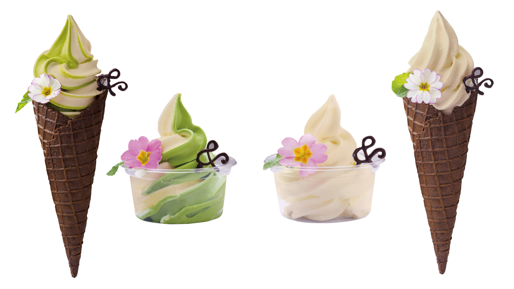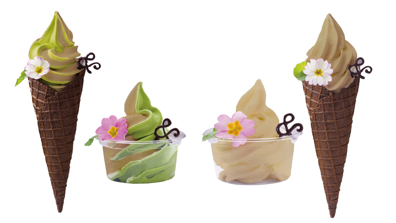 石臼で丁寧に挽くため1時間に40グラムしか取れない高級宇治抹茶を使用した特製抹茶ソフトクリームとの組み合わせとして、宇治抹茶用の中でも一番茶として扱われる原料だけで作ったファーストフラッシュほうじ茶ソフト、100%フランス産天然由来の自然なベルガモット香料を使用したロイヤルアールグレイソフトをご提供致します。