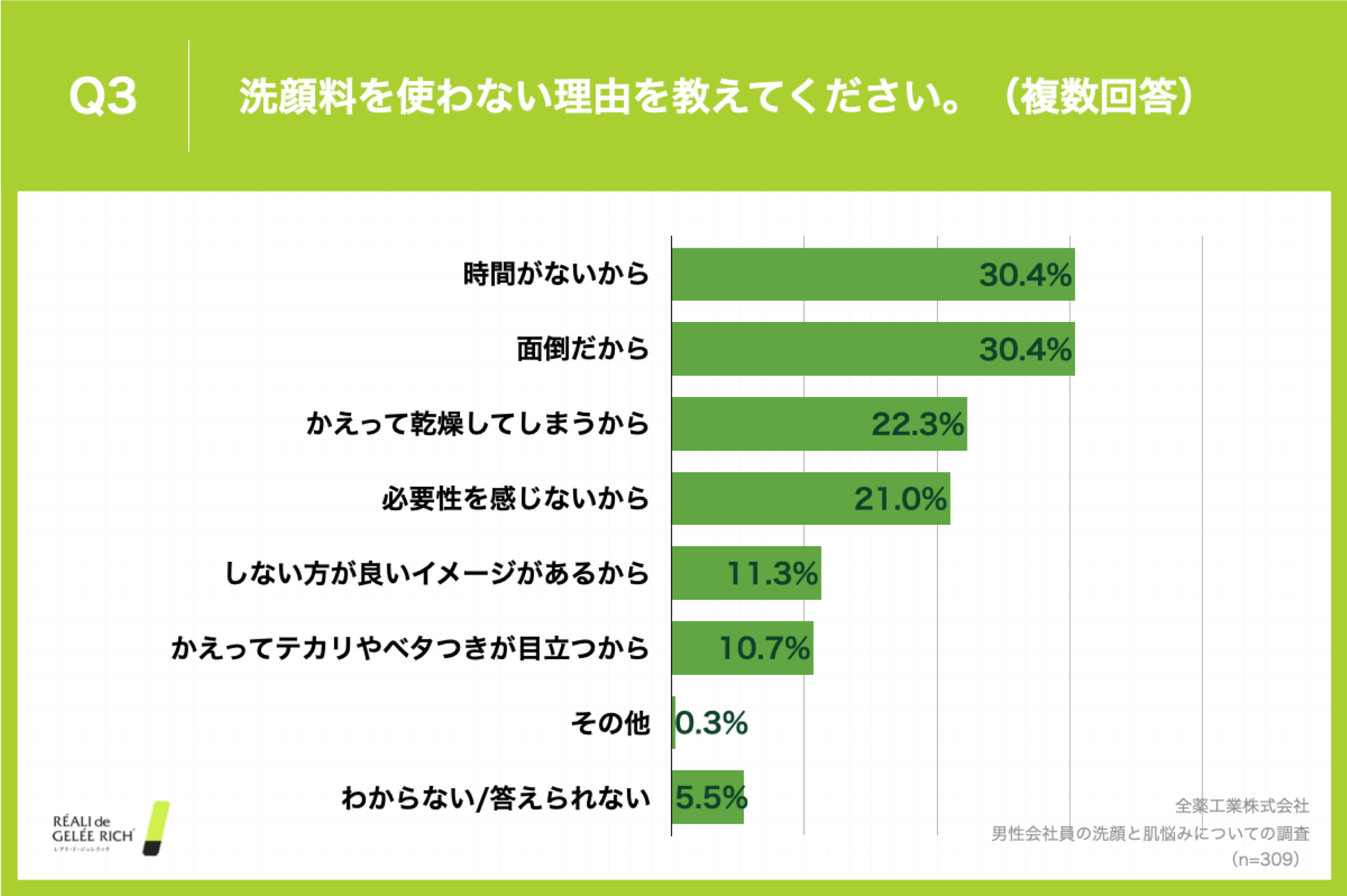 Q3. 「洗顔料を使わない理由を教えてください。(複数回答)」と質問したところ、「時間がないから」、「面倒だから」がともに30.4%、「かえって乾燥してしまうから」が22.3%という回答となりました。(n=309)